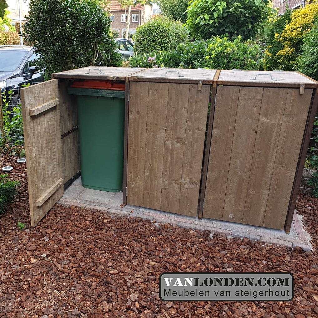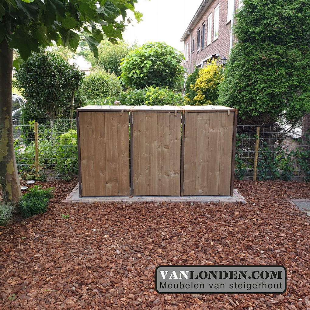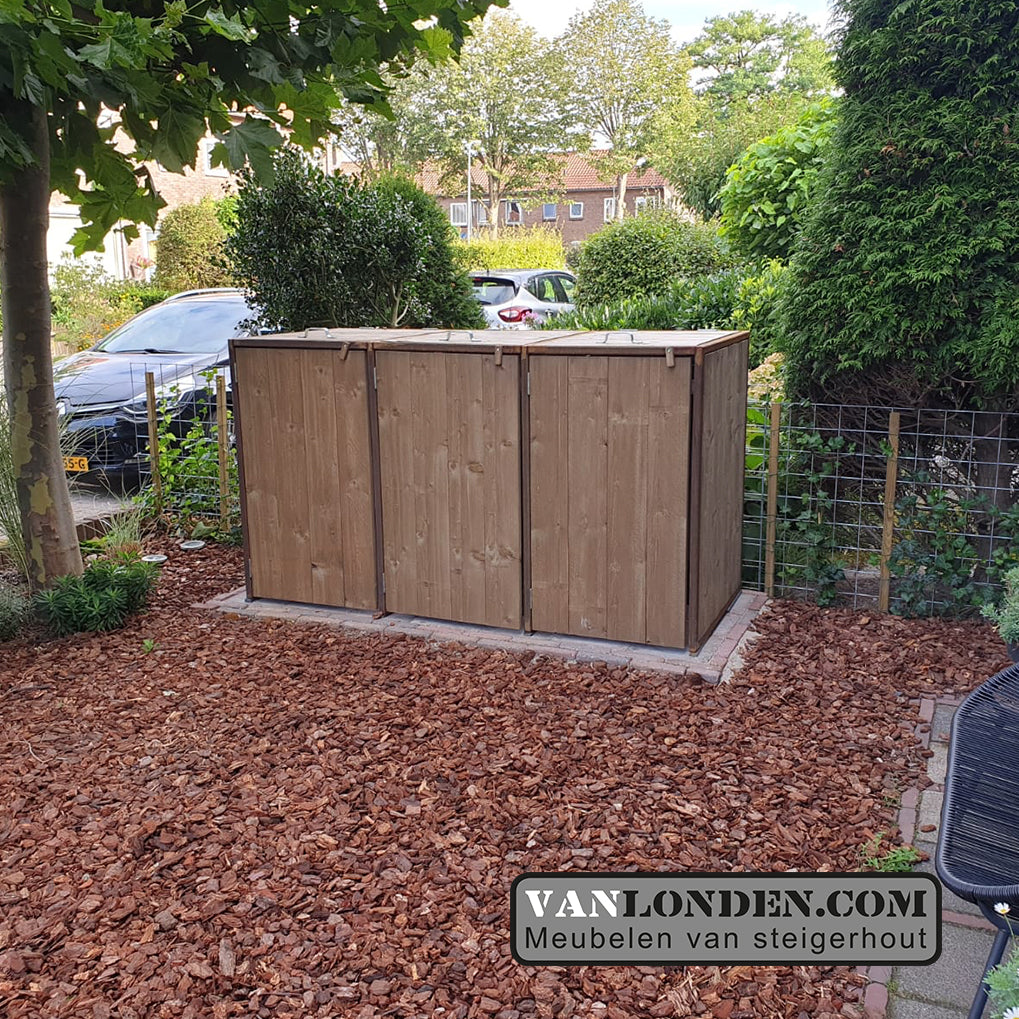 Deze stoere steigerhouten ombouw is geschikt voor 3 Kliko 's en heeft een stalen frame. Hele stabiele ombouw dus en een praktische oplossing voor een opgeruimd terras!