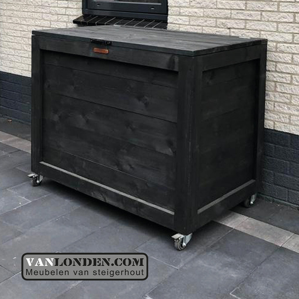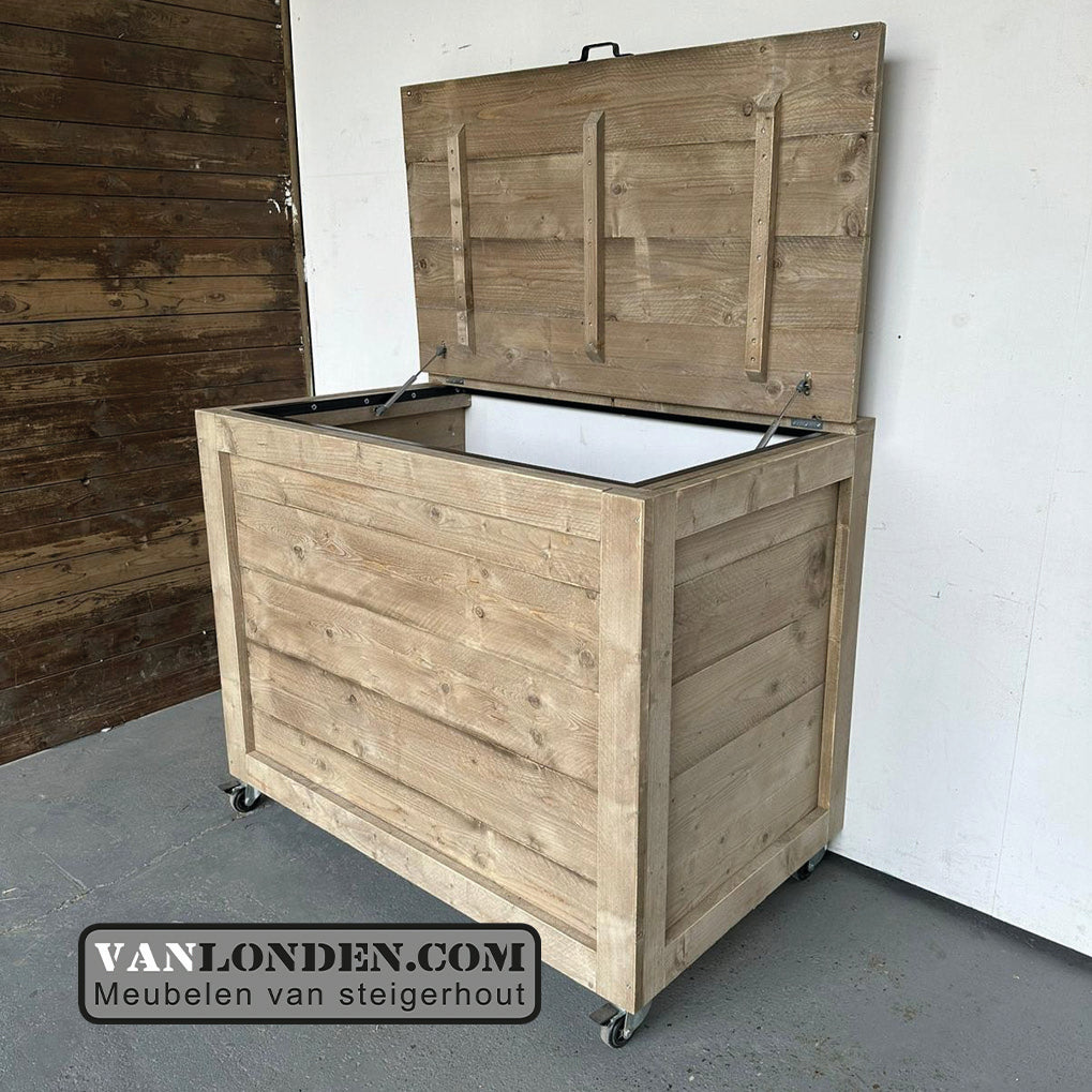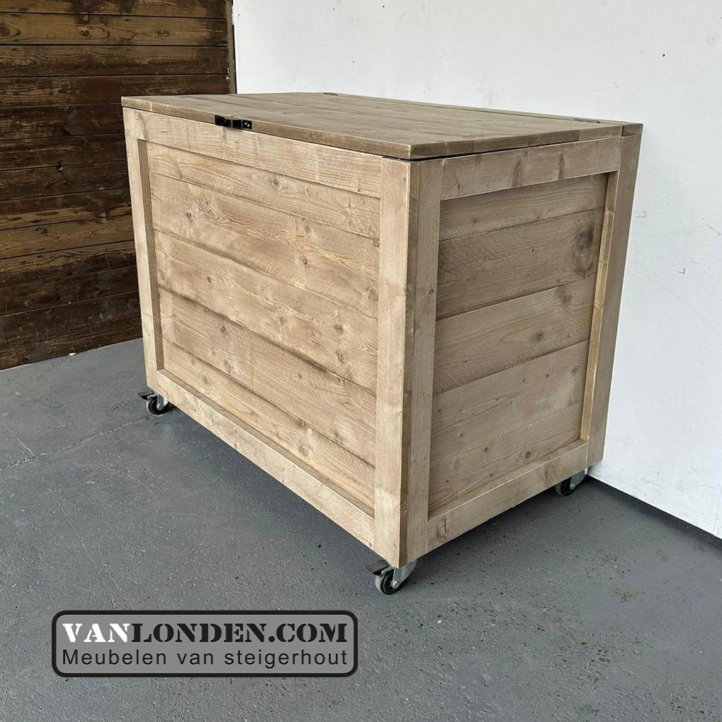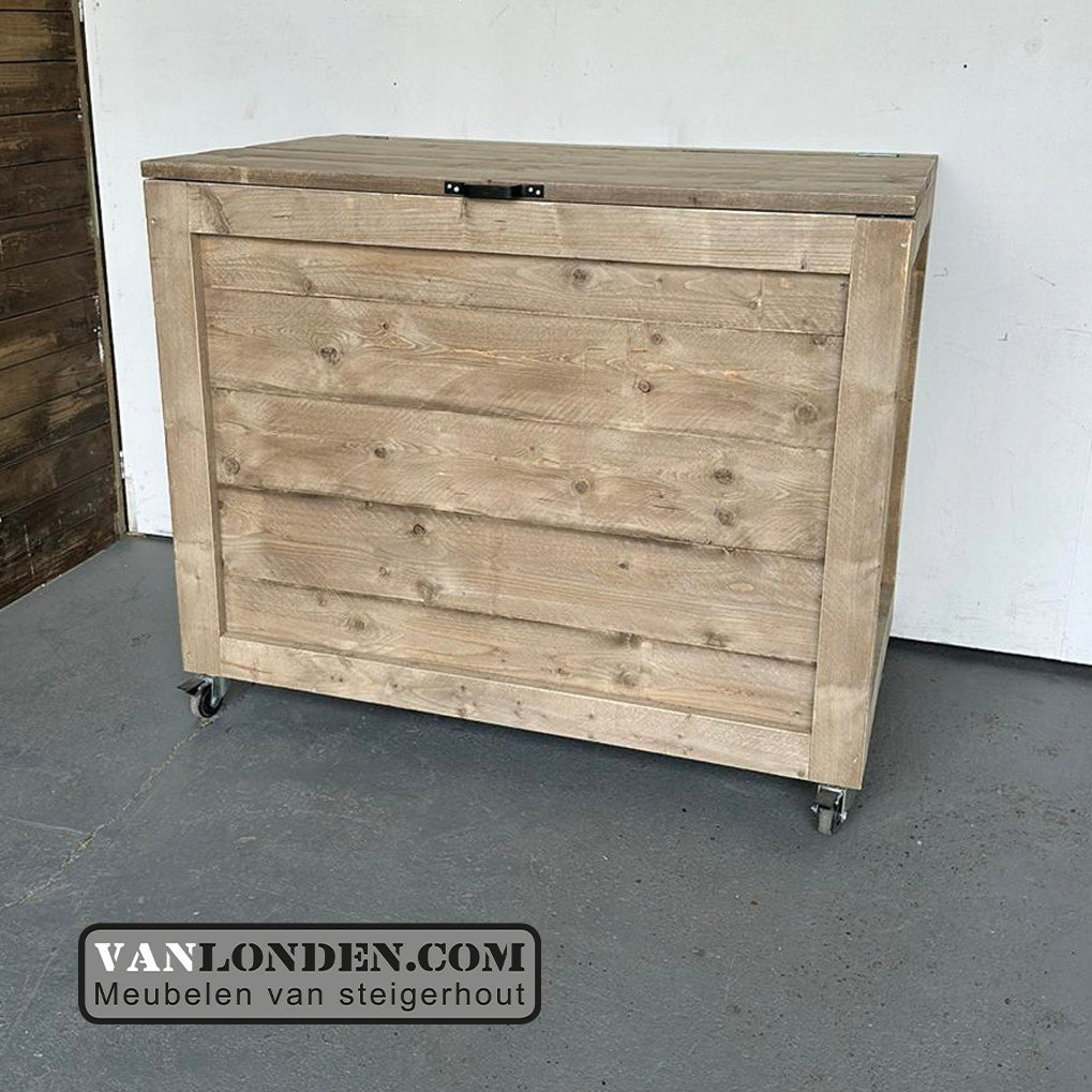 Maak jouw terras opgeruimd en georganiseerd met onze steigerhouten kliko ombouw met gasveren. Deze stoere steigerhouten ombouw is geschikt voor 2 Kliko 's en dankzij de zwenkwielen aan de onderkant en de open achterkant is het verplaatsen over de kliko's heel eenvoudig. De ombouw is extra stevig door een stalen frame en de stevigheid van het steigerhout zorgt voor een lange levensduur.