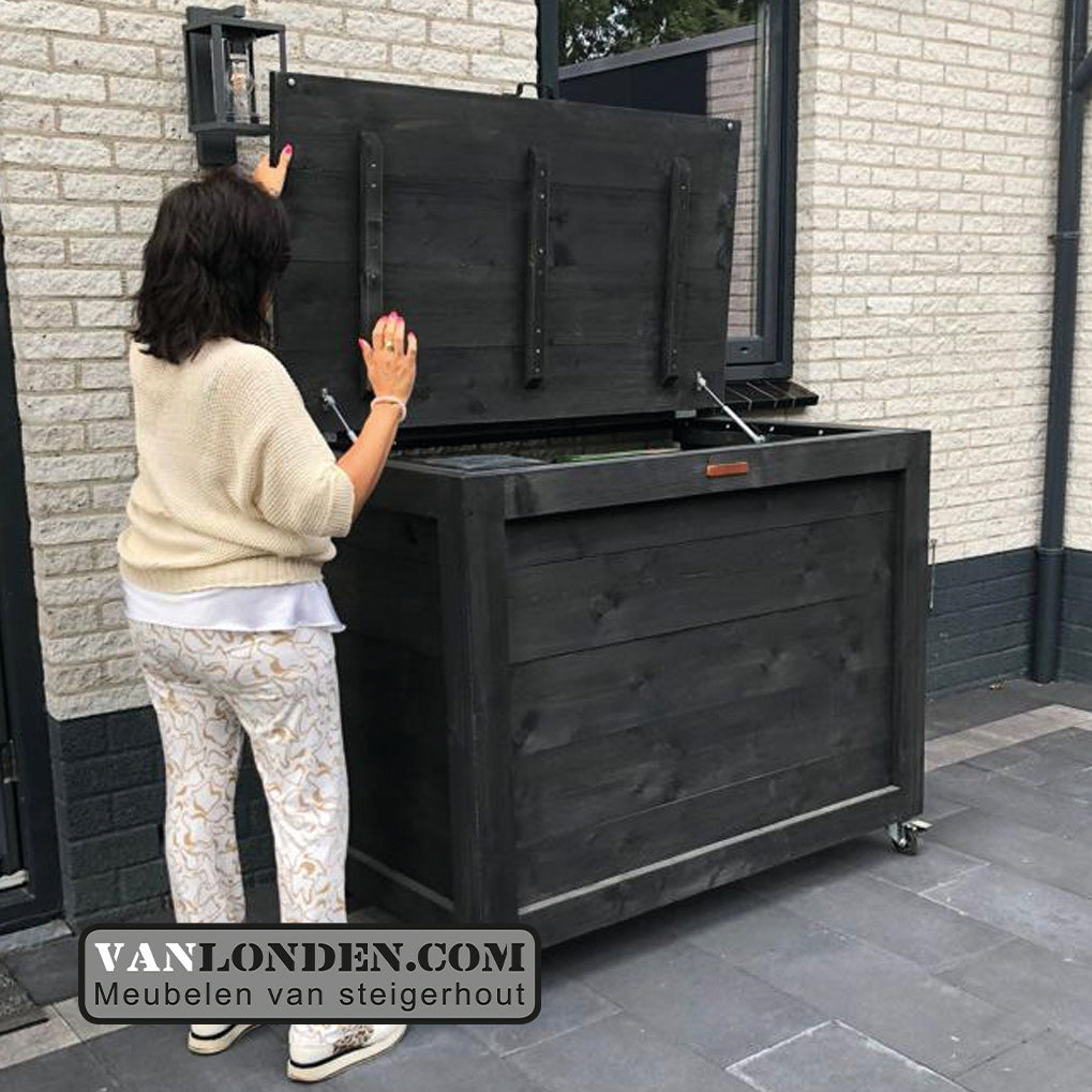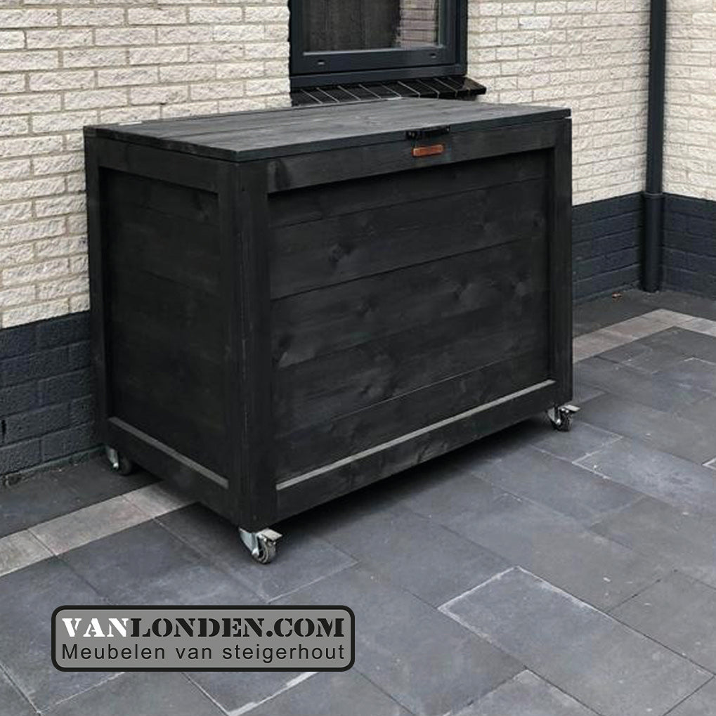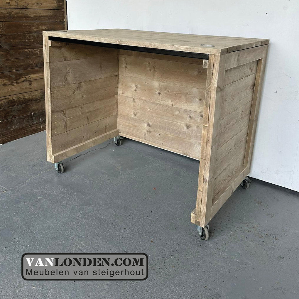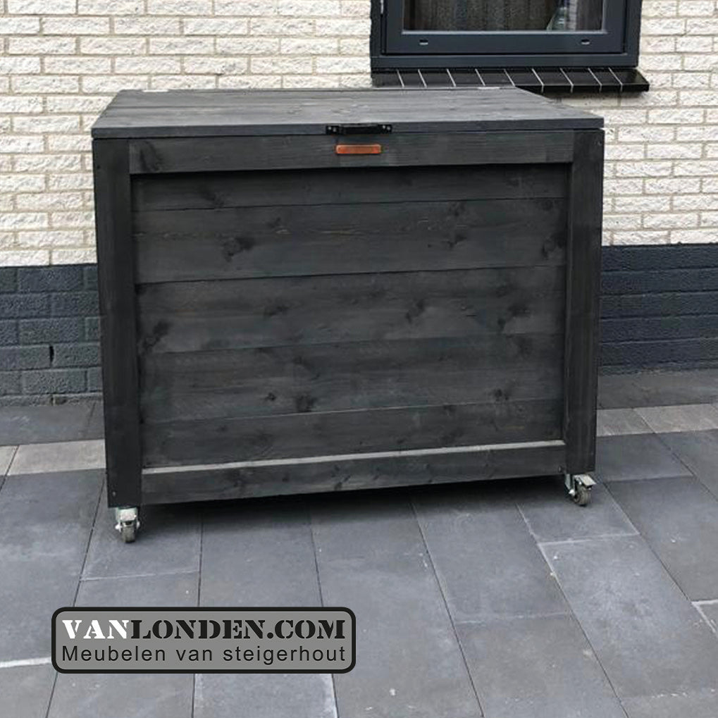 Maak jouw terras opgeruimd en georganiseerd met onze steigerhouten kliko ombouw met gasveren. Deze stoere steigerhouten ombouw is geschikt voor 2 Kliko 's en dankzij de zwenkwielen aan de onderkant en de open achterkant is het verplaatsen over de kliko's heel eenvoudig. De ombouw is extra stevig door een stalen frame en de stevigheid van het steigerhout zorgt voor een lange levensduur.