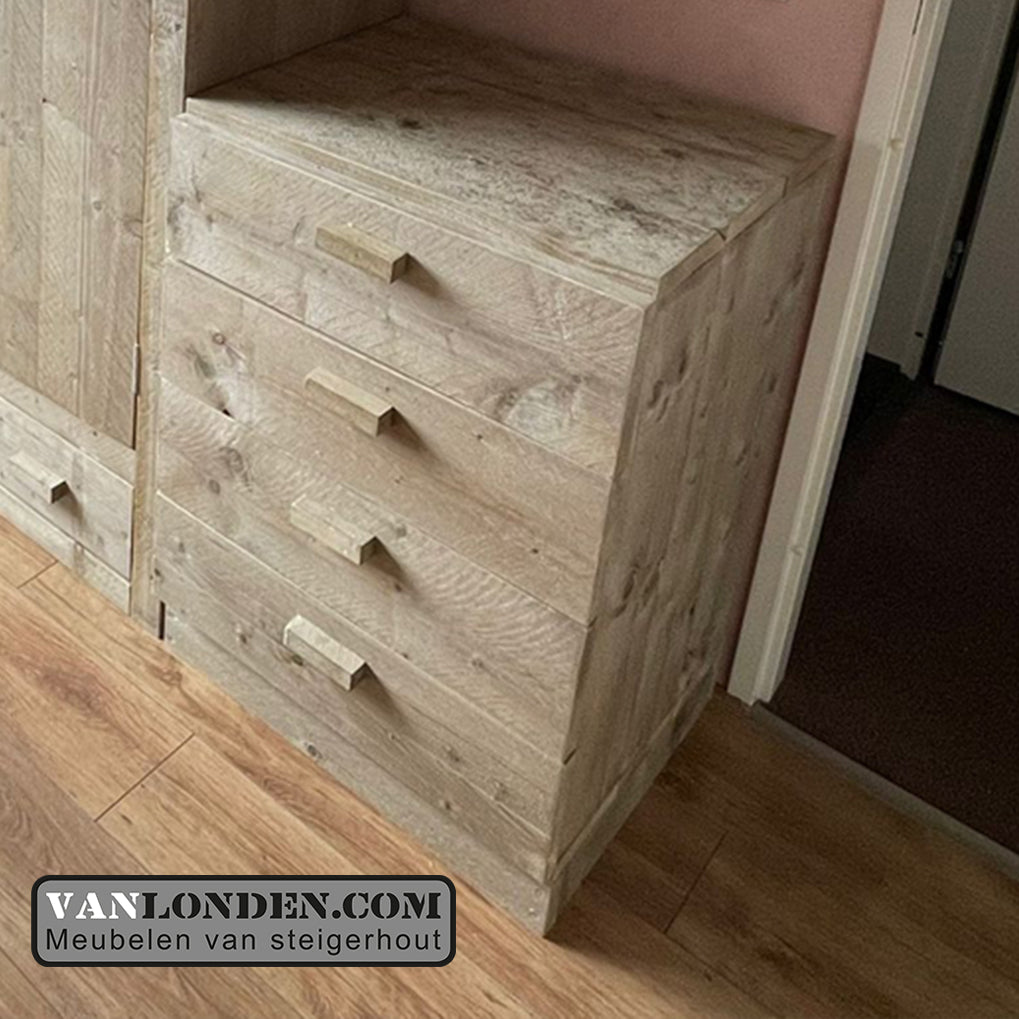 Steigerhouten ladenkastje met 4 lades, passend bij kledingkast Esther, eenvoudig mooi. Te gebruiken als nachtkastje, maar ook als bureau ladenkastje.