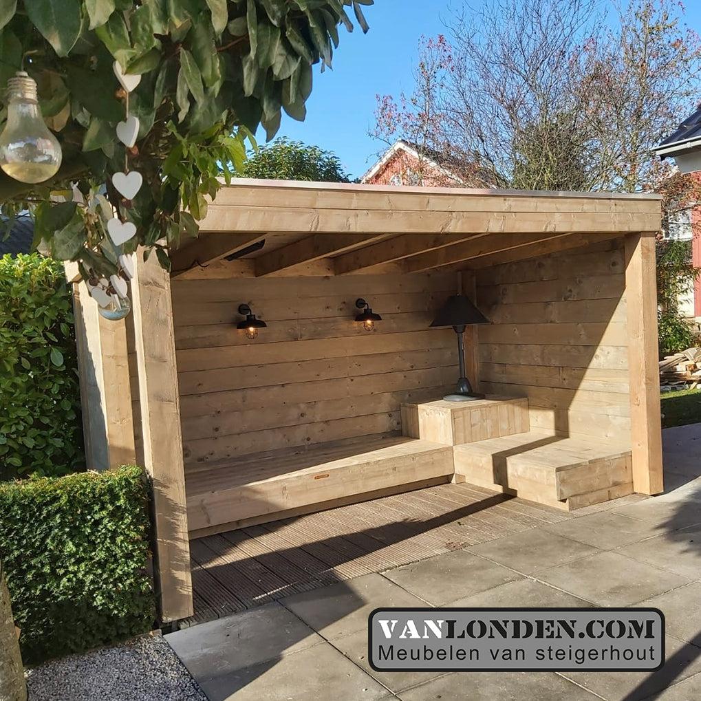 Een mooi en praktische overkapping voor heerlijk relaxen in de tuin. Deze overkapping is laag, zodat deze niet te veel boven de tuin uitsteekt en creëert zo een heerlijk beschut plekje.