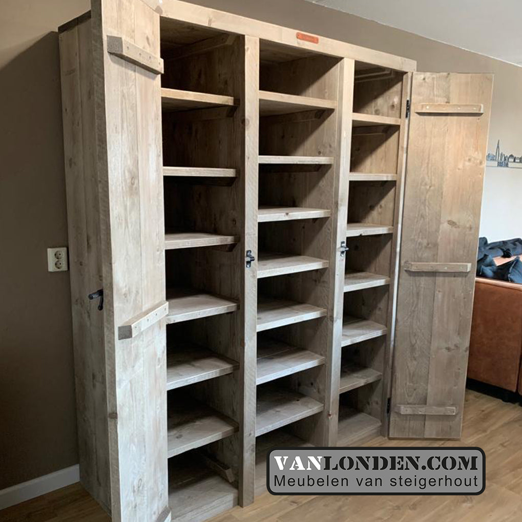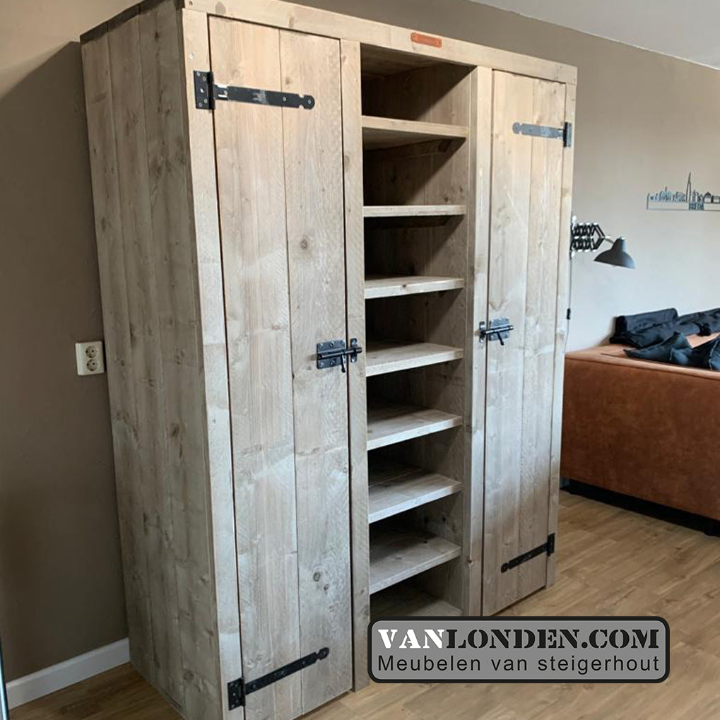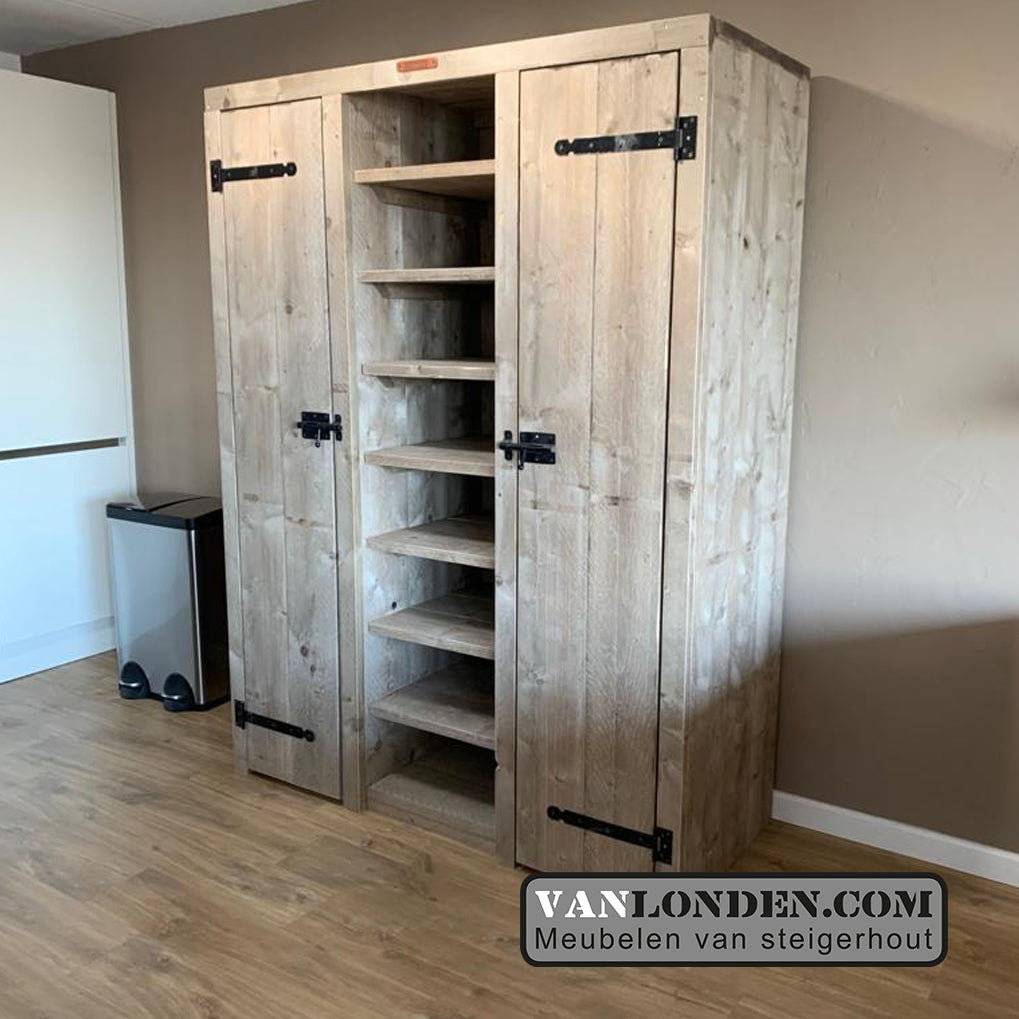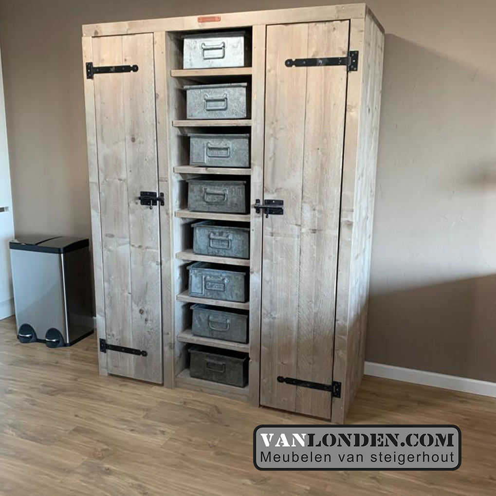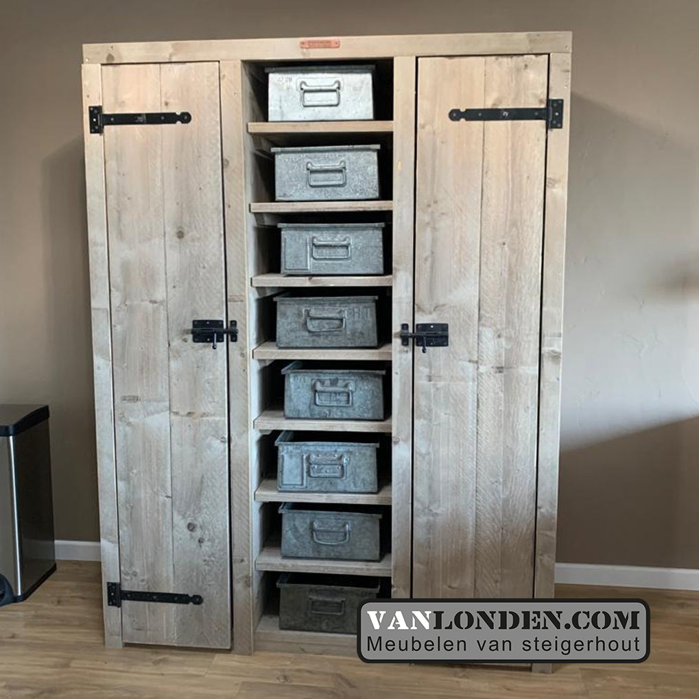 Steigerhouten opbergkast Ilonka, mooi aan te vullen met de stalen bakken, zoals op de foto. 2 deuren aan de zijkant met ieder 6 planken en in het midden 7 opbergplanken. Een opgeruimd geheel met de deuren dicht, om boeken, speelgoed, servies, schoolspullen en wat je nog meer kunt verzinnen, mooi geordend op te kunnen bergen in deze stoere kast!