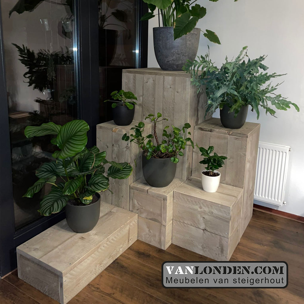 Dit steigerhouten planteneiland bestaat uit losse elementen, waardoor je de opstelling helemaal naar wens kunt opstellen en aanpassen aan de plek waar je je planten wilt zetten..