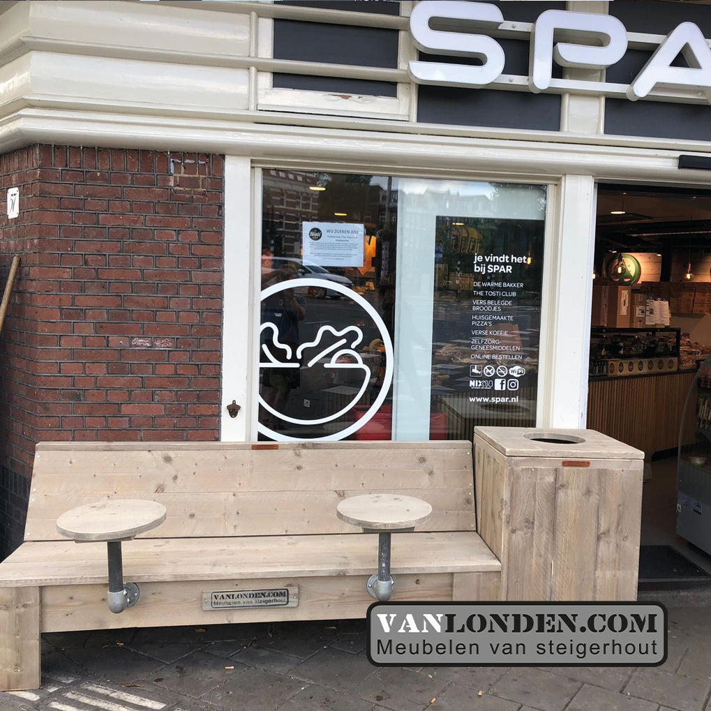 Een grote steigerhouten prullenbakombouw, handig én mooi voor buiten in je tuin, maar ook zakelijk heel goed toe te passen naast een bankje voor op je terras.