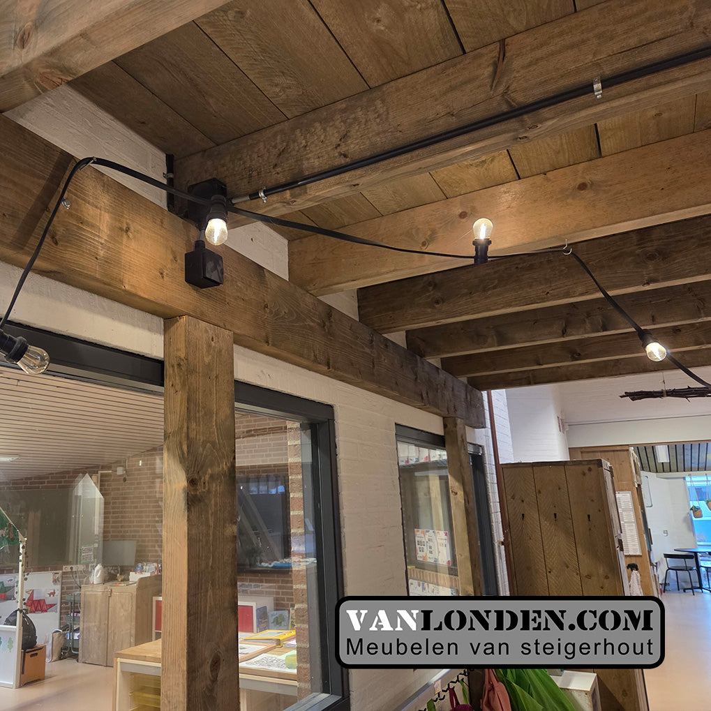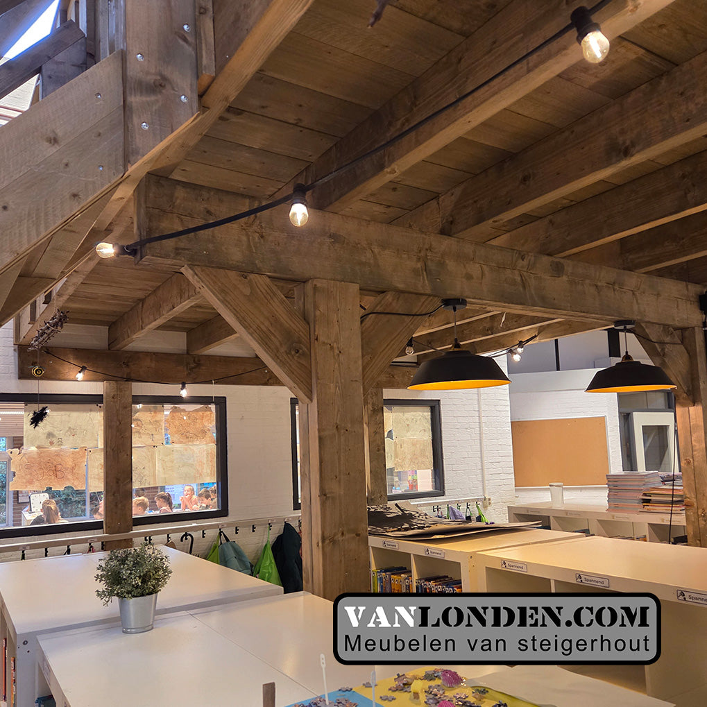 Met een vide benut je de hoogte van een ruimte optimaal en ontstaat er eenvoudig een extra verdieping voor opslag, presentatie of werkruimte. Dankzij het robuuste maar goed geschuurde steigerhout krijgt de ruimte direct een warme en karaktervolle uitstraling. Uiteraard maken we ook gebruik van grote dikke balken zodat de constructie super stevig wordt.