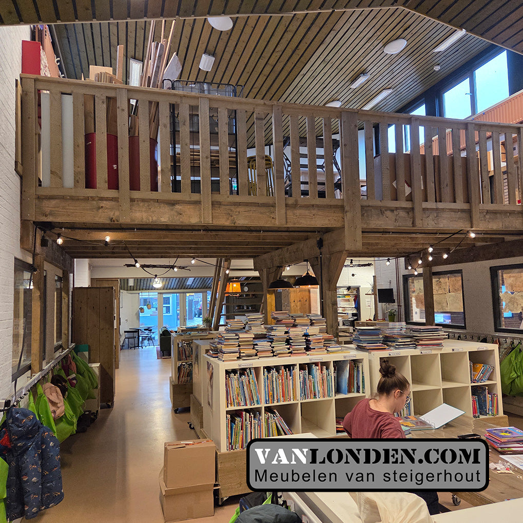Op maat gemaakte steigerhouten vide / verdiepingsvloer, ideaal voor het creëren van extra ruimte in bijvoorbeeld een winkel, showroom of andere bedrijfsruimte.