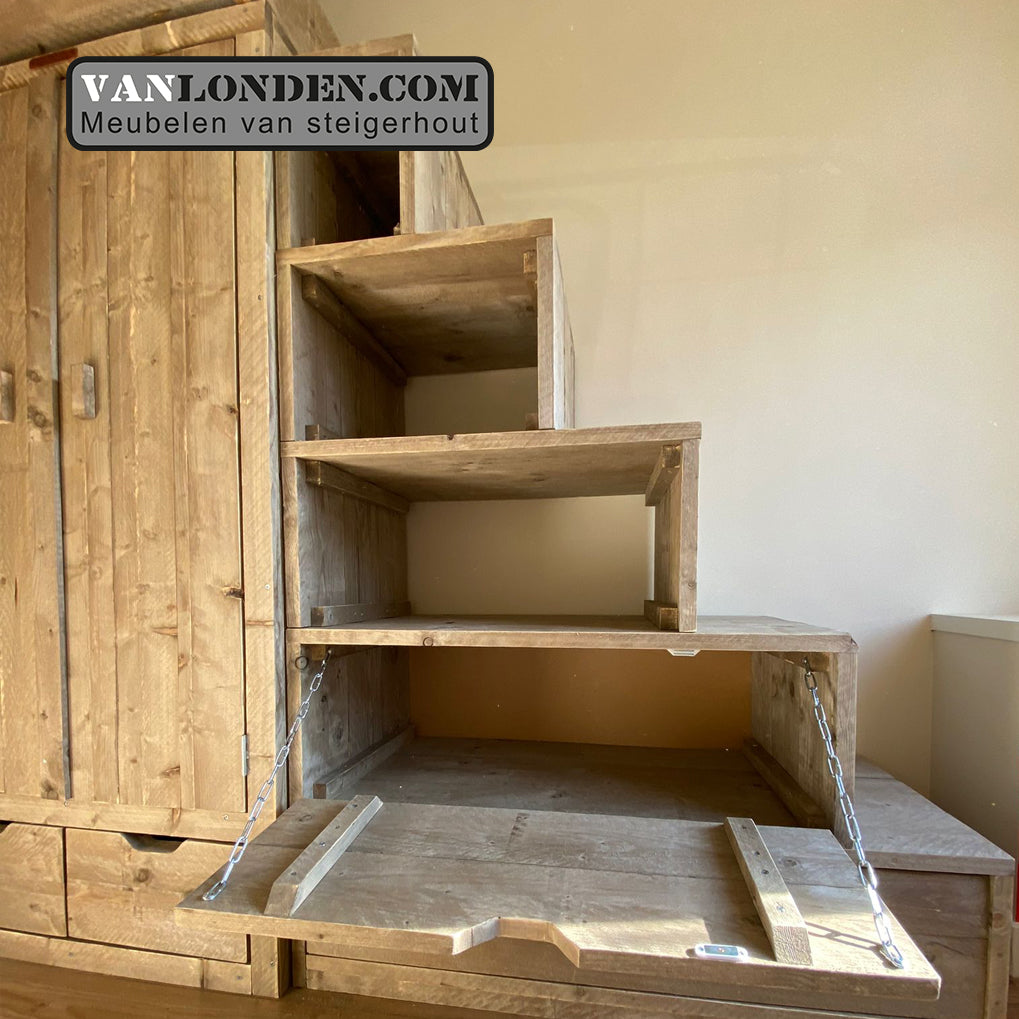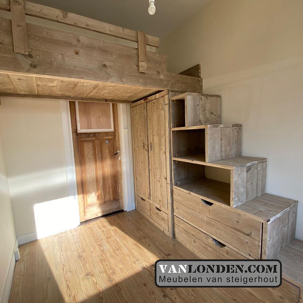 Hoe handig is dit mooie vide bed in een kleine ruimte. Je hebt in een keer een compleet inrichting voor je kinder- of studentenkamer! Er is een kast en open vakken/lades in het meubel geintegreerd en deze dienen meteen ook als trap met extra opbergruimte.