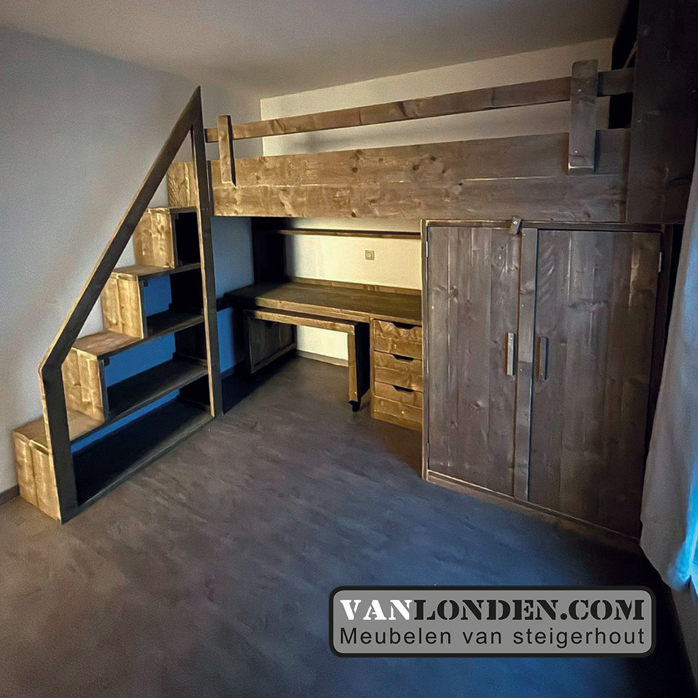 Praktische en multifunctionele inrichting voor een kleine slaapkamer met dit vide bed. Een compleet inrichting voor de kinder- of studentenkamer! Het bed heeft een kast en een bureau met bankje, maar de trap dient meteen ook als opbergruimte met de open vakken.