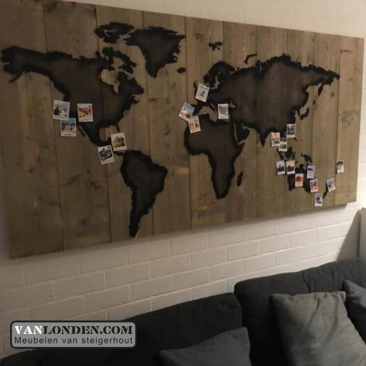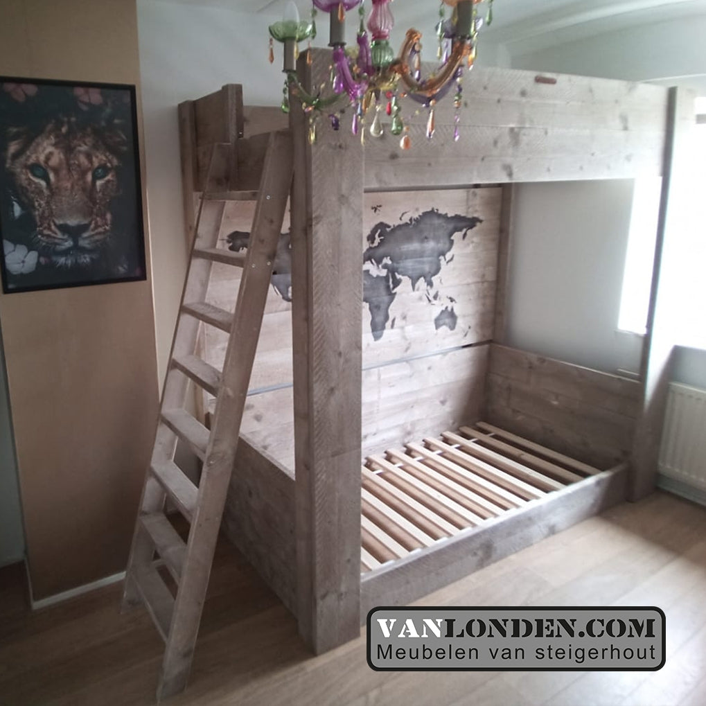 Steigerhouten stapelbed Jonathan met wereldkaart