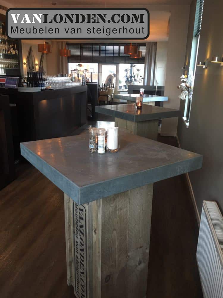 Mooie robuuste steigerhouten statafel met vierkant zinken tafelblad in verouderde look. Praktisch en mooi bij feestjes binnen óf buiten. Het zinken blad is heel eenvoudig schoon te maken.
