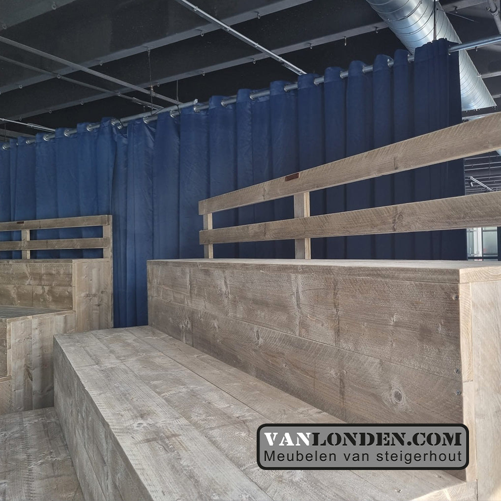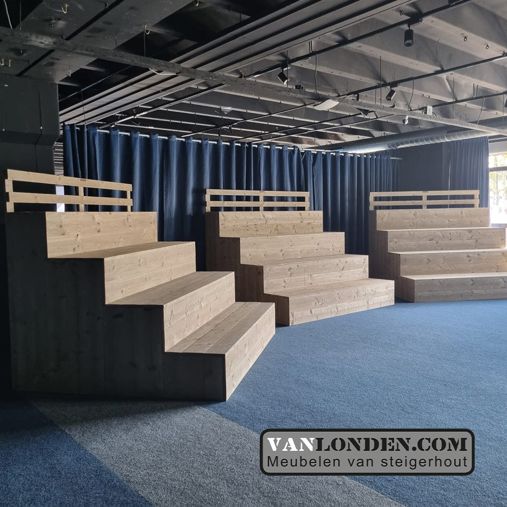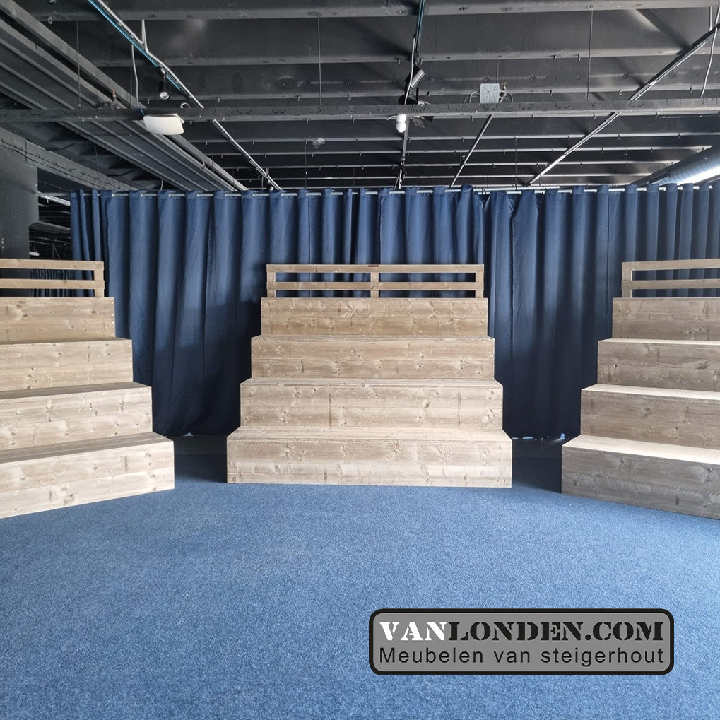 Steigerhouten tribune met 4 zitlagen en rugleuning bovenin. Ideaal voor scholen en bedrijven en solide en sterk genoeg voor volwassenen en kinderen!