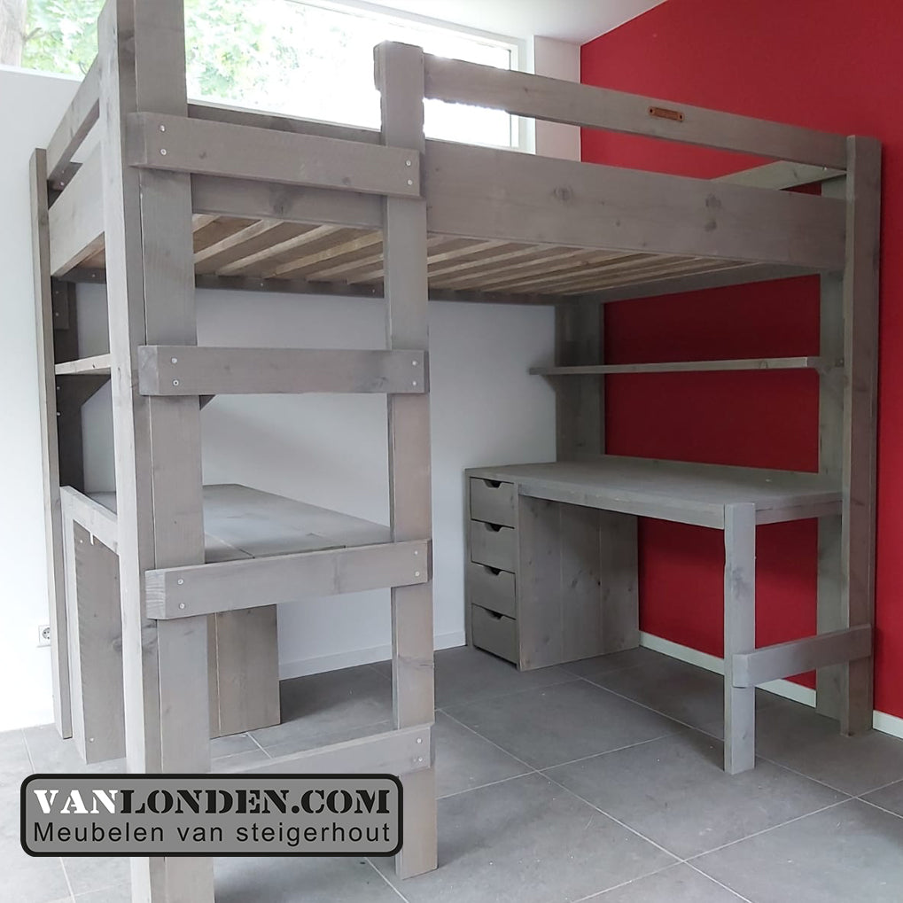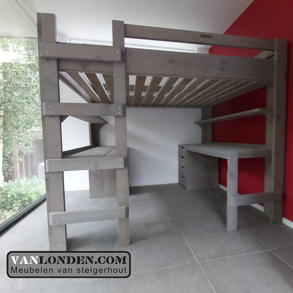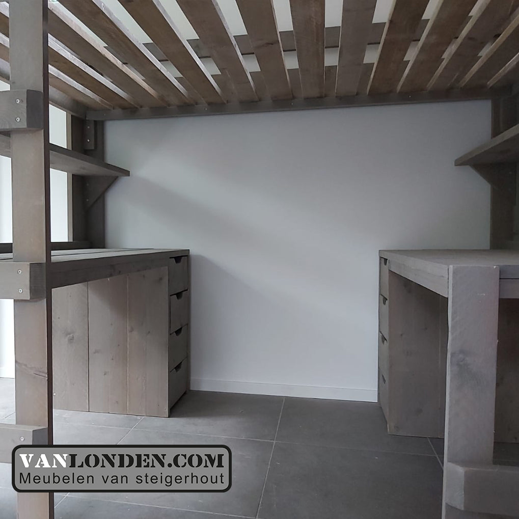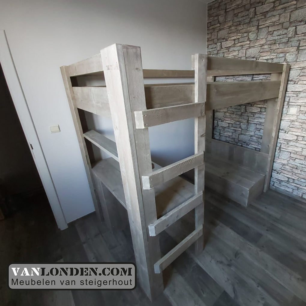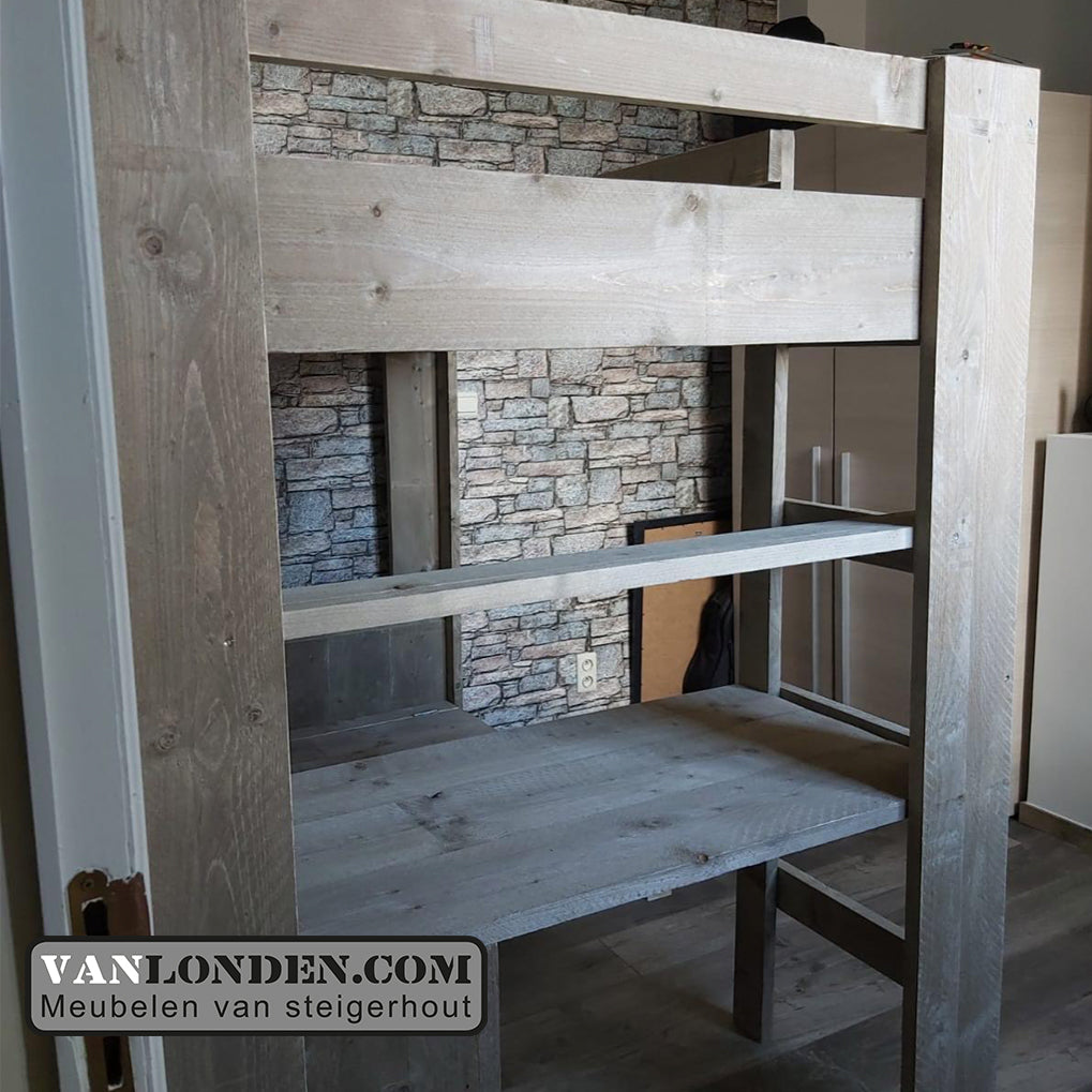 Steigerhouten tweepersoons hoogslaper met bureau en loungeplek in een met dit unieke stoere bed Marlieke in de kleur Greywood. Bovenin een bed van 120 x 200 cm (of naar wens in 140 x 200 cm) en onder een bureau en kist/bankje met handige klep voor extra bergruimte. Genoeg plaats voor logees en studeren of relaxen onder het bed tegelijkertijd. Super stevig en stabiel.