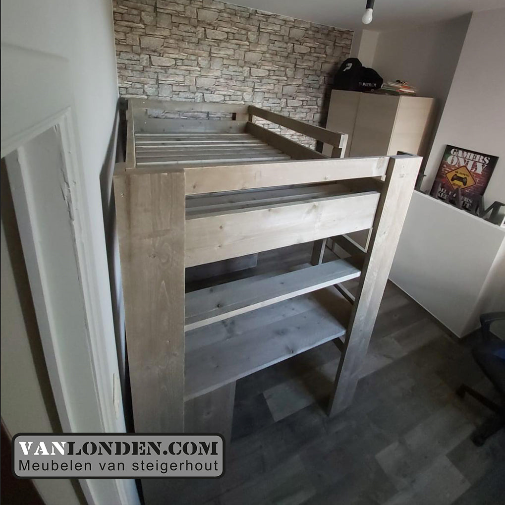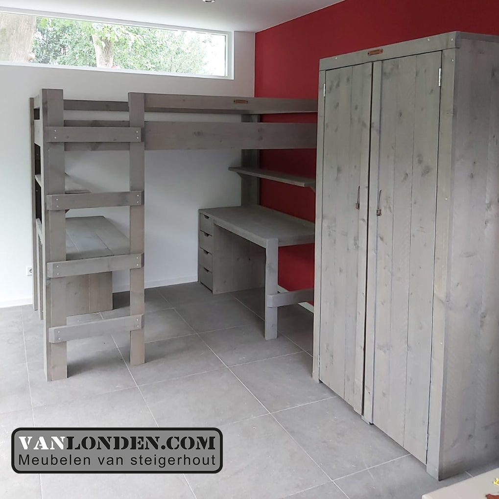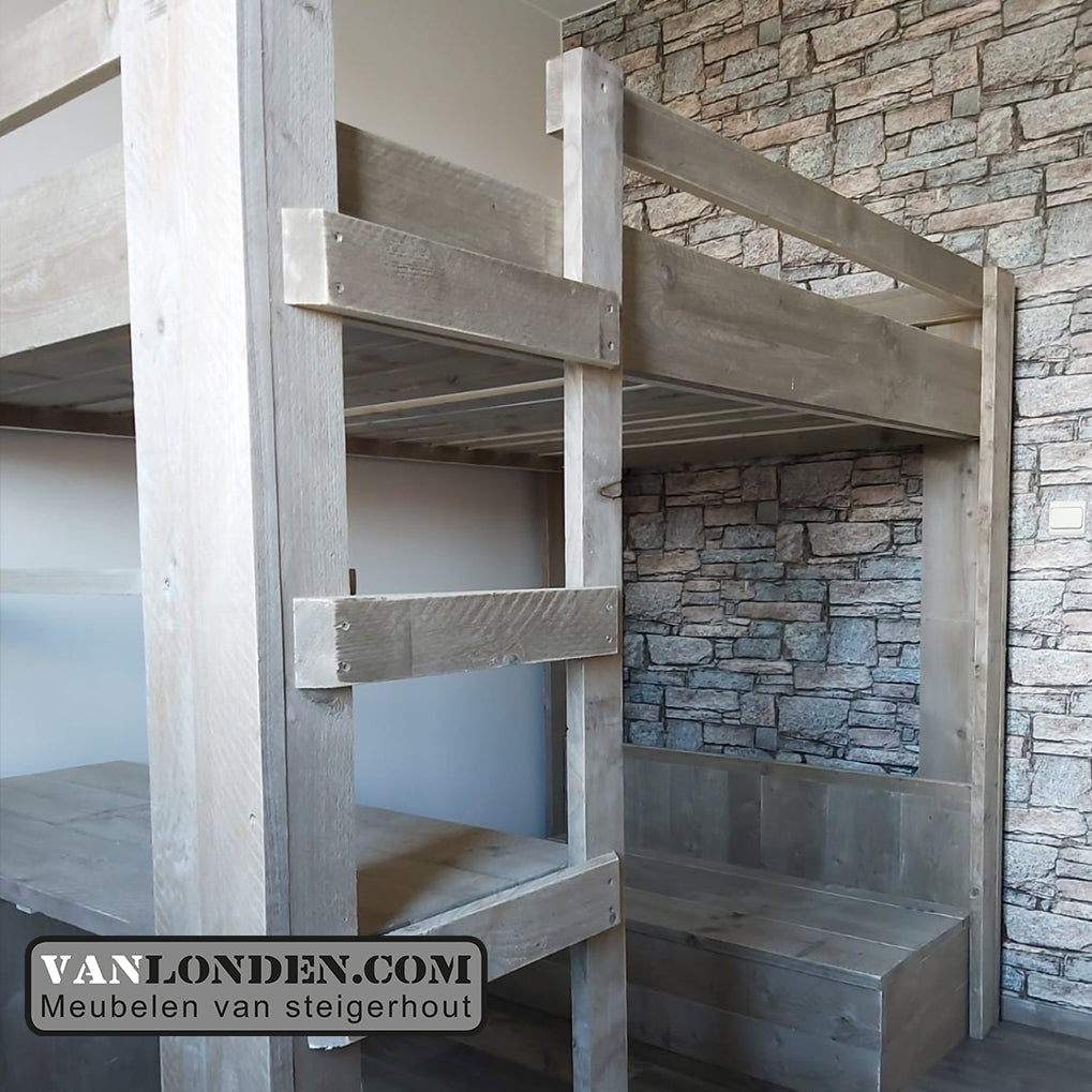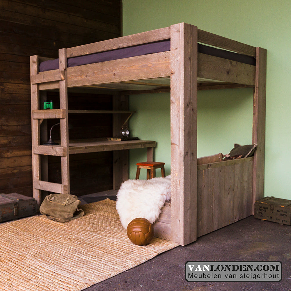 Steigerhouten tweepersoons hoogslaper met bureau en loungeplek in een met dit unieke stoere bed Marlieke in de kleur Greywood. Bovenin een bed van 120 x 200 cm (of naar wens in 140 x 200 cm) en onder een bureau en kist/bankje met handige klep voor extra bergruimte. Genoeg plaats voor logees en studeren of relaxen onder het bed tegelijkertijd. Super stevig en stabiel.
