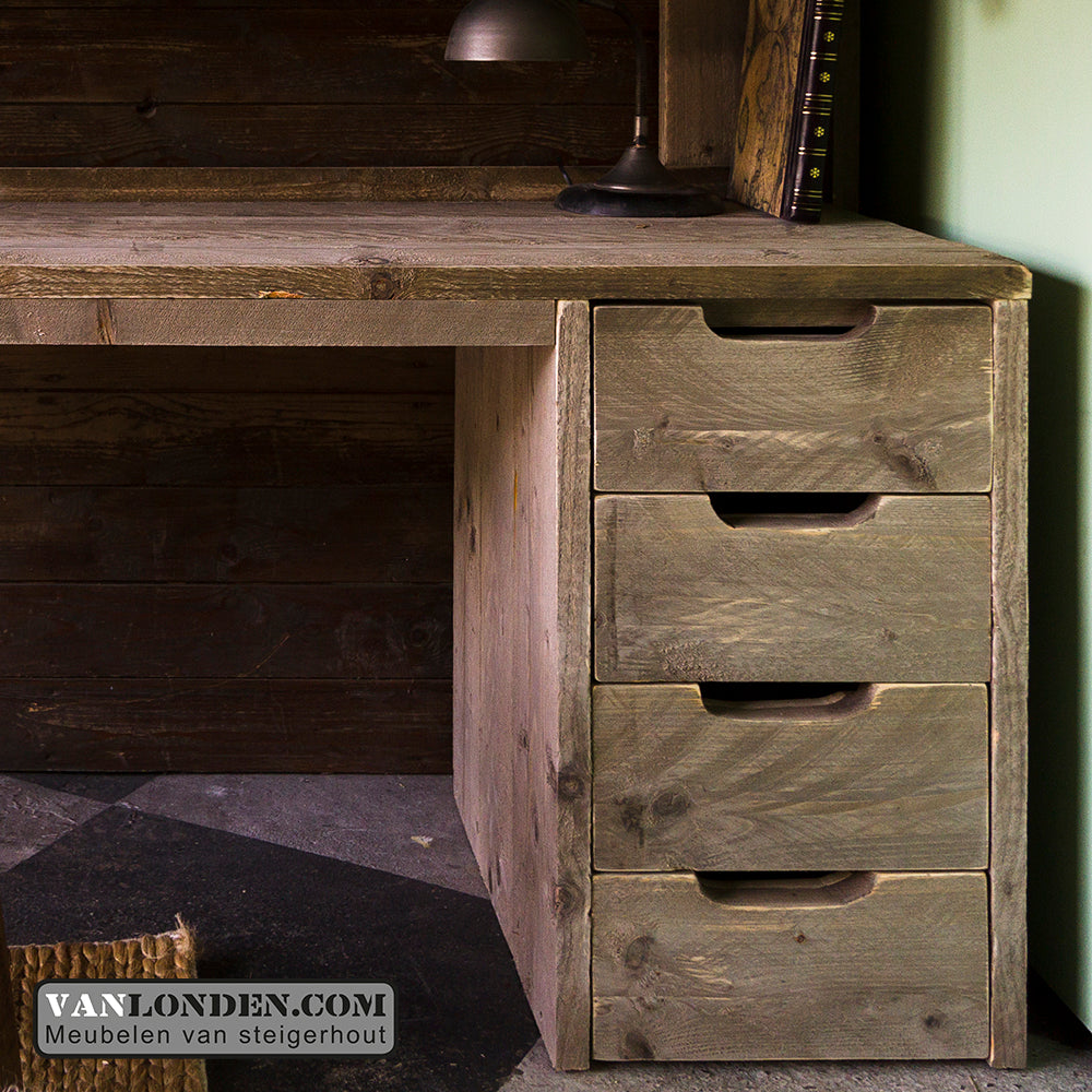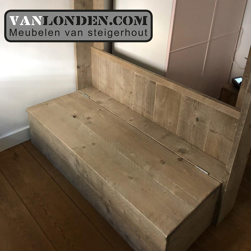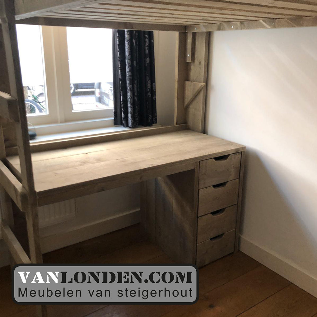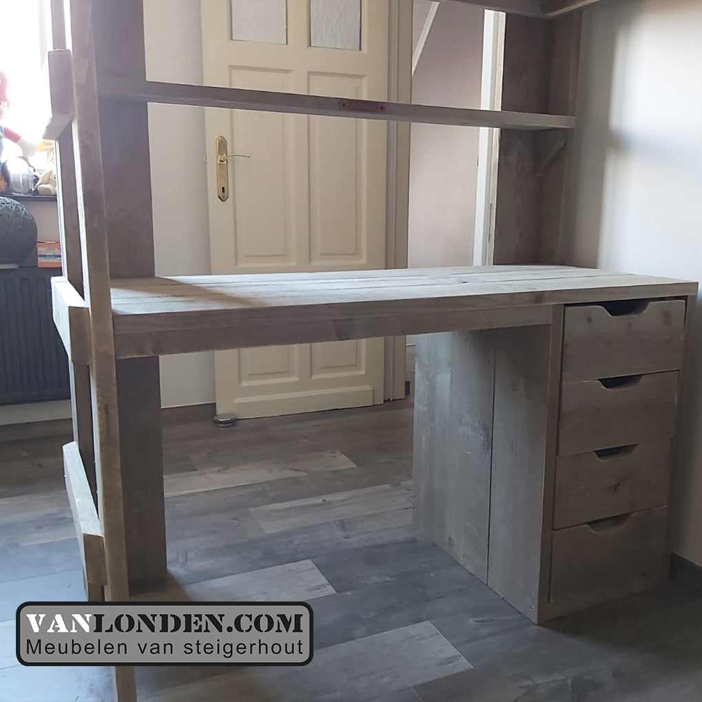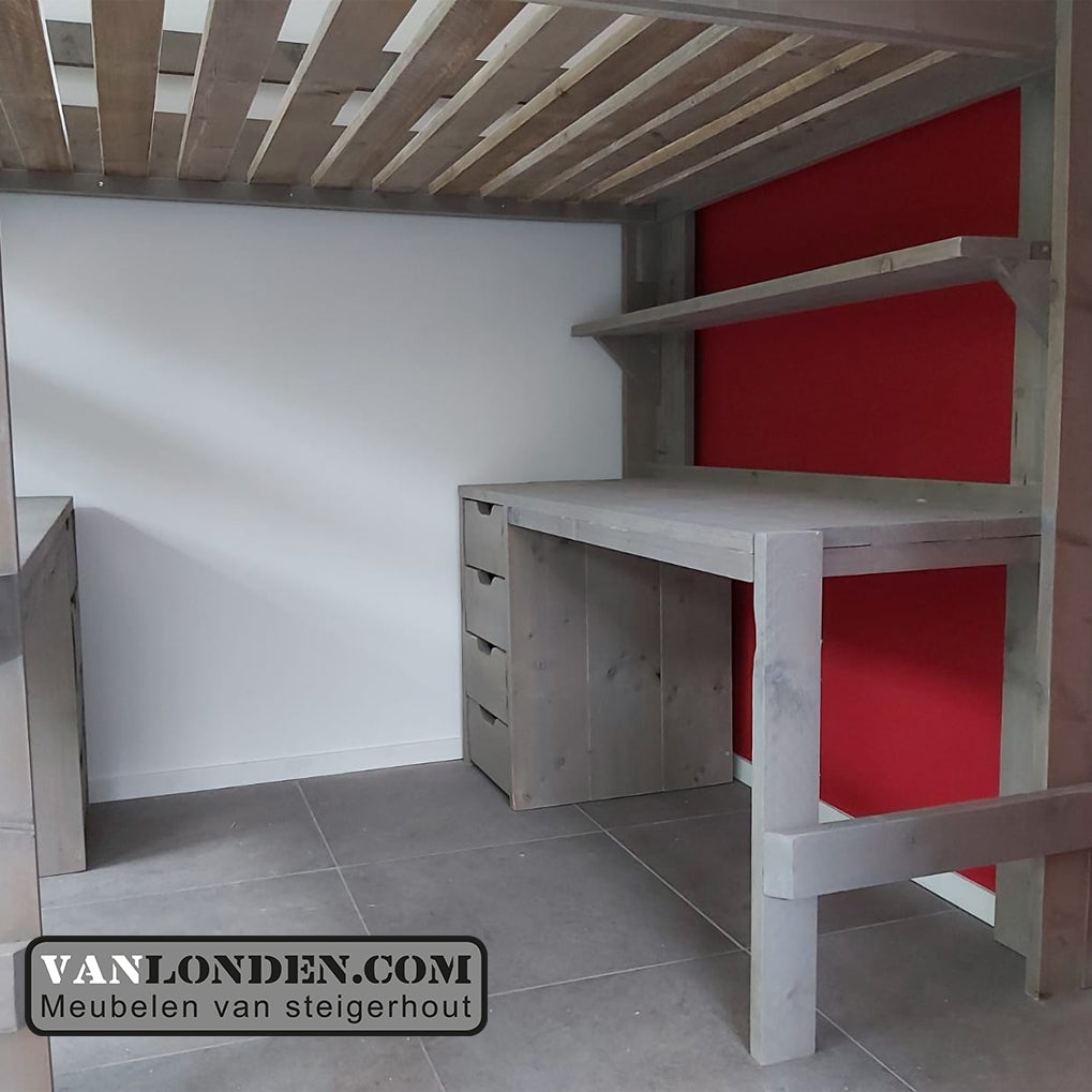 Steigerhouten tweepersoons hoogslaper met bureau en loungeplek in een met dit unieke stoere bed Marlieke in de kleur Greywood. Bovenin een bed van 120 x 200 cm (of naar wens in 140 x 200 cm) en onder een bureau en kist/bankje met handige klep voor extra bergruimte. Genoeg plaats voor logees en studeren of relaxen onder het bed tegelijkertijd. Super stevig en stabiel.