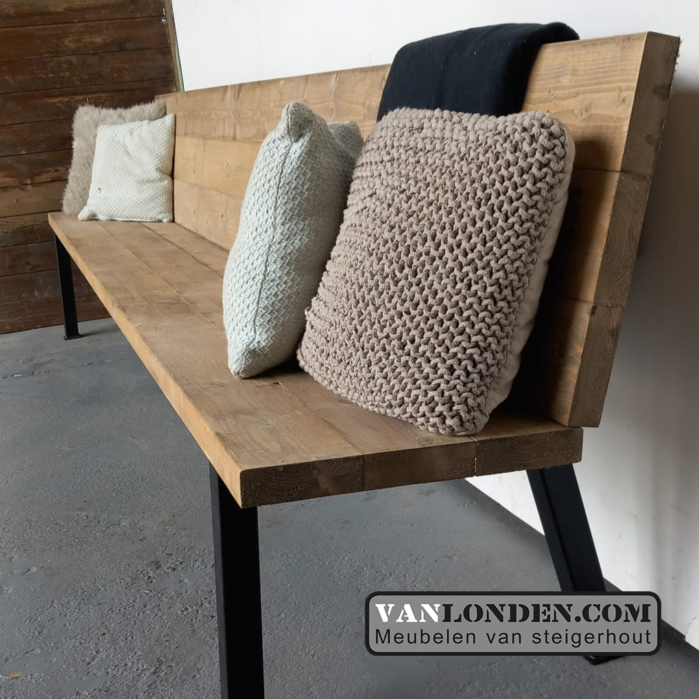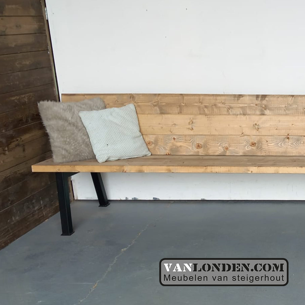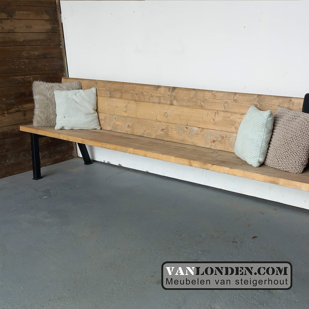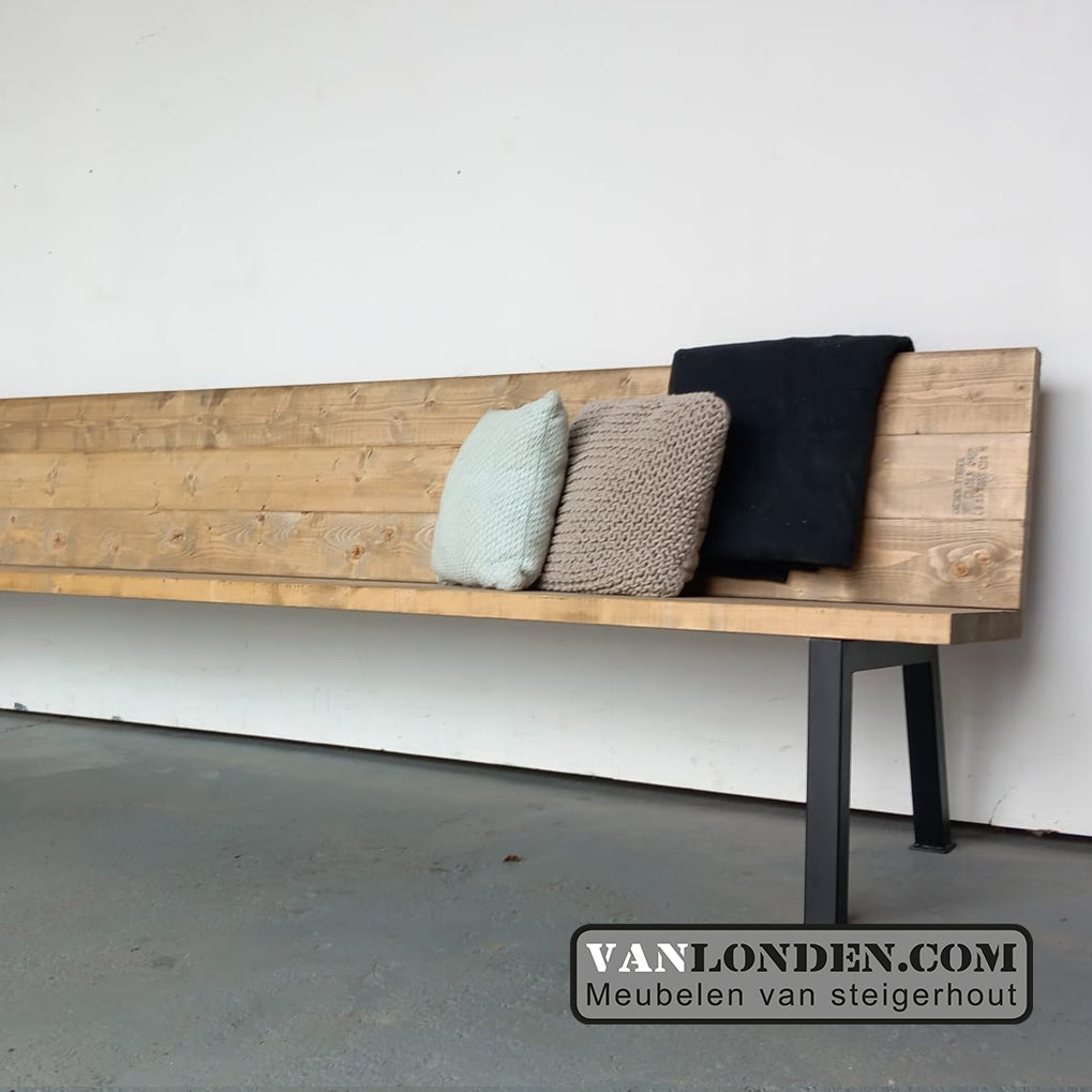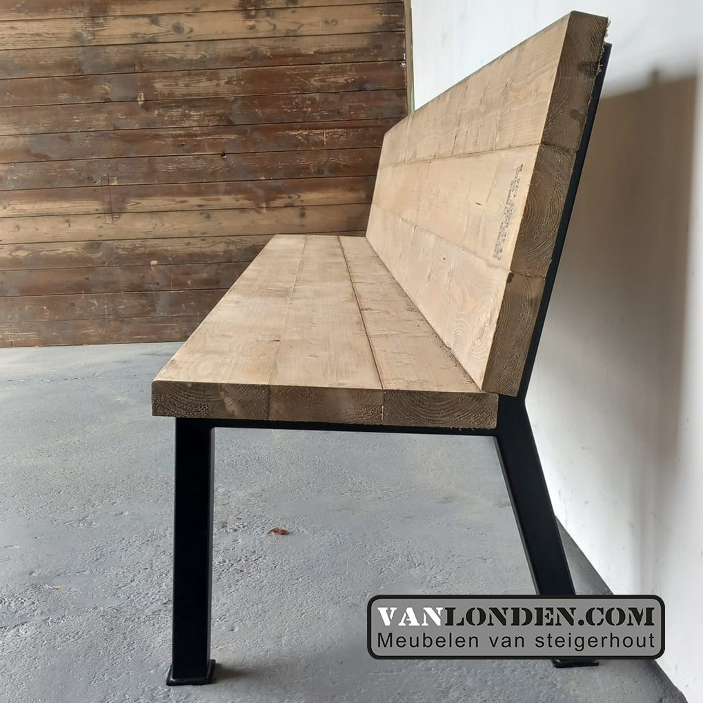 Mooie steigerhouten bank met stalen poten, strak vormgegeven en zowel binnen als buiten te gebruiken.