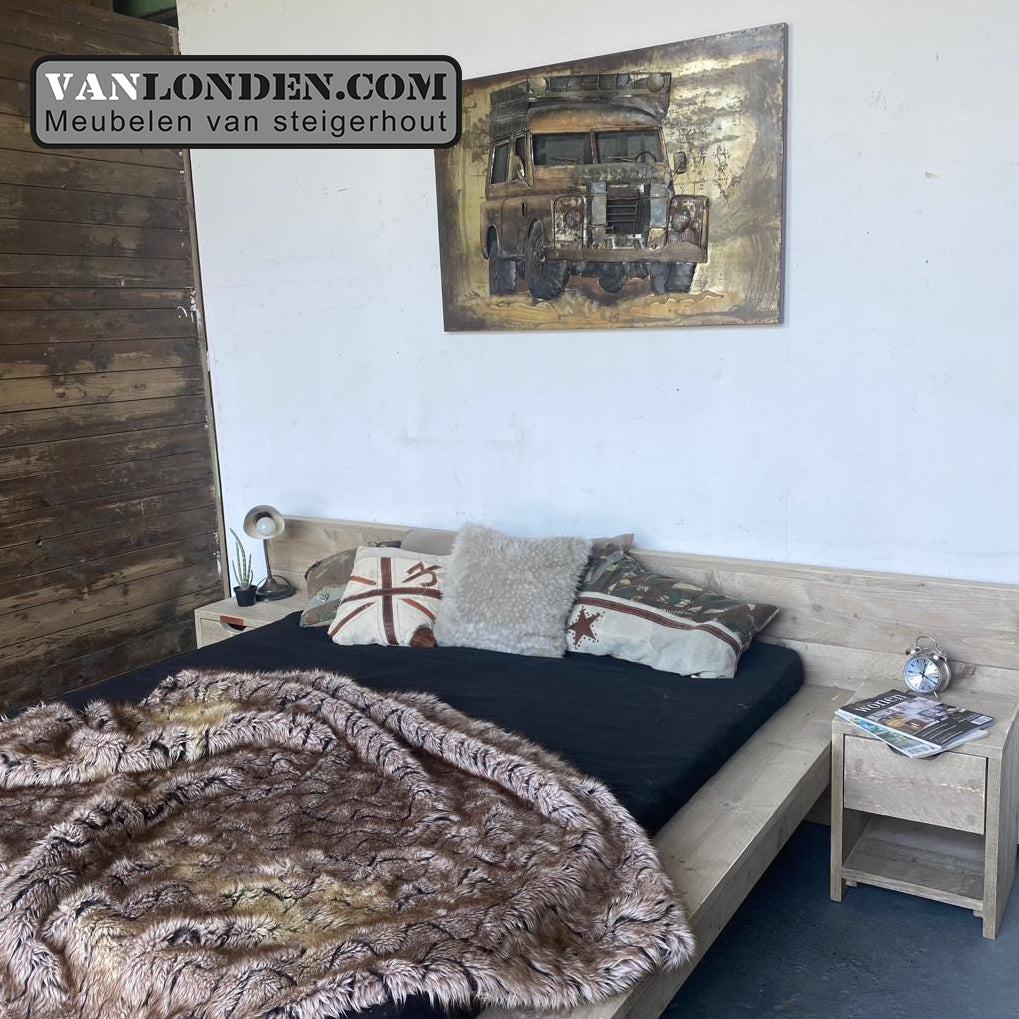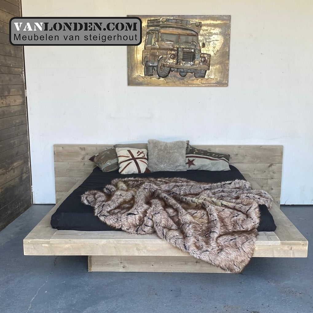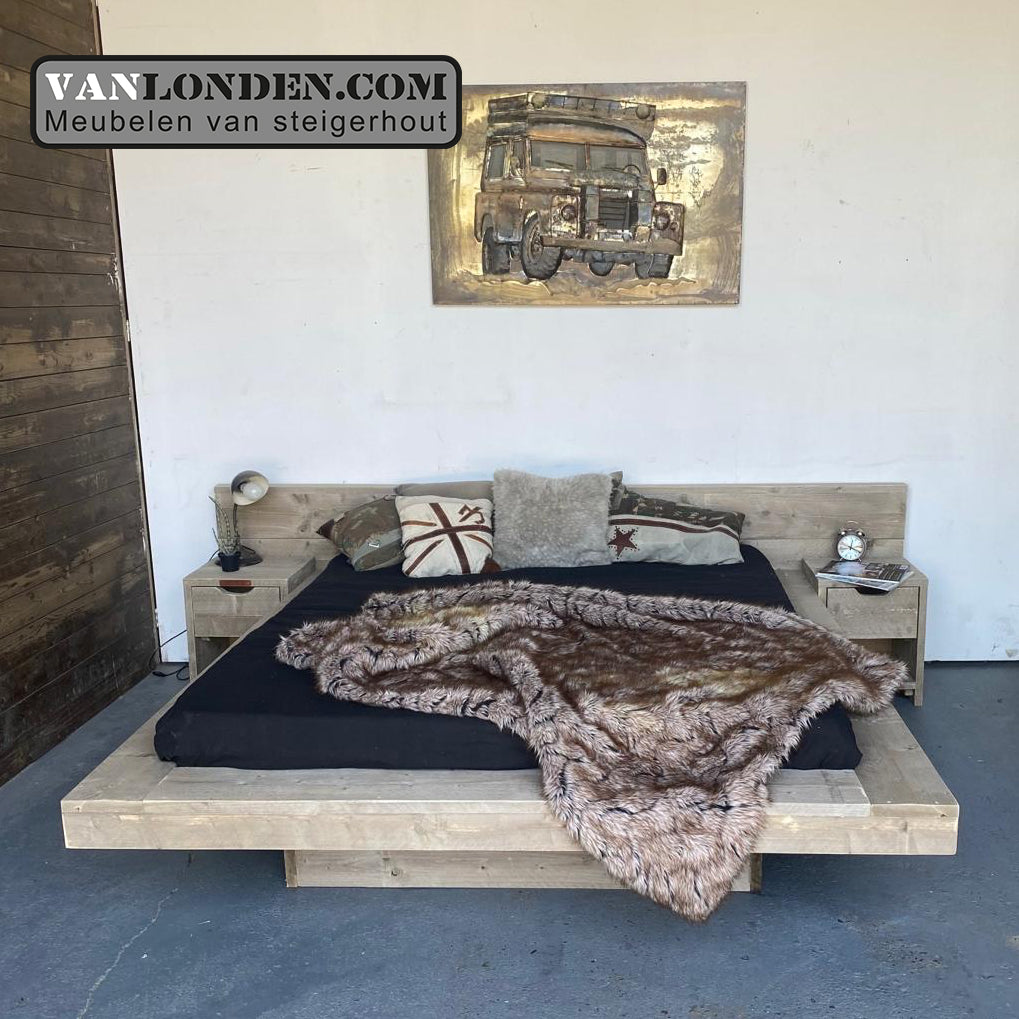 Steigerhouten tweepersoonsbed Jena is zwevend van de grond, een modern en strak vormgegeven bed. Wil je er ook een kastje bij? Kijk dan ook eens bij onze collectie nachtkastjes