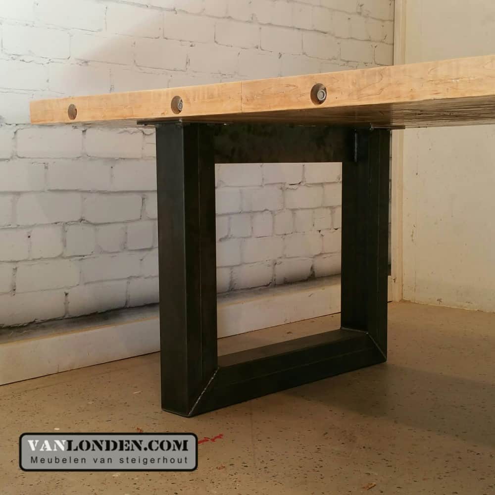 Originele tafel gemaakt van oude bowlingbaan delen met een stoere, industriële look door de robuuste stalen poten en afwerking.