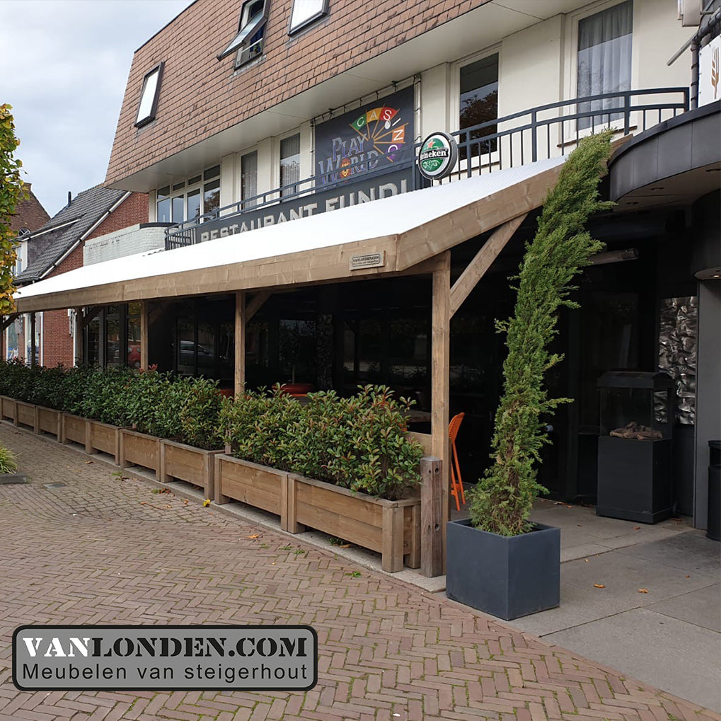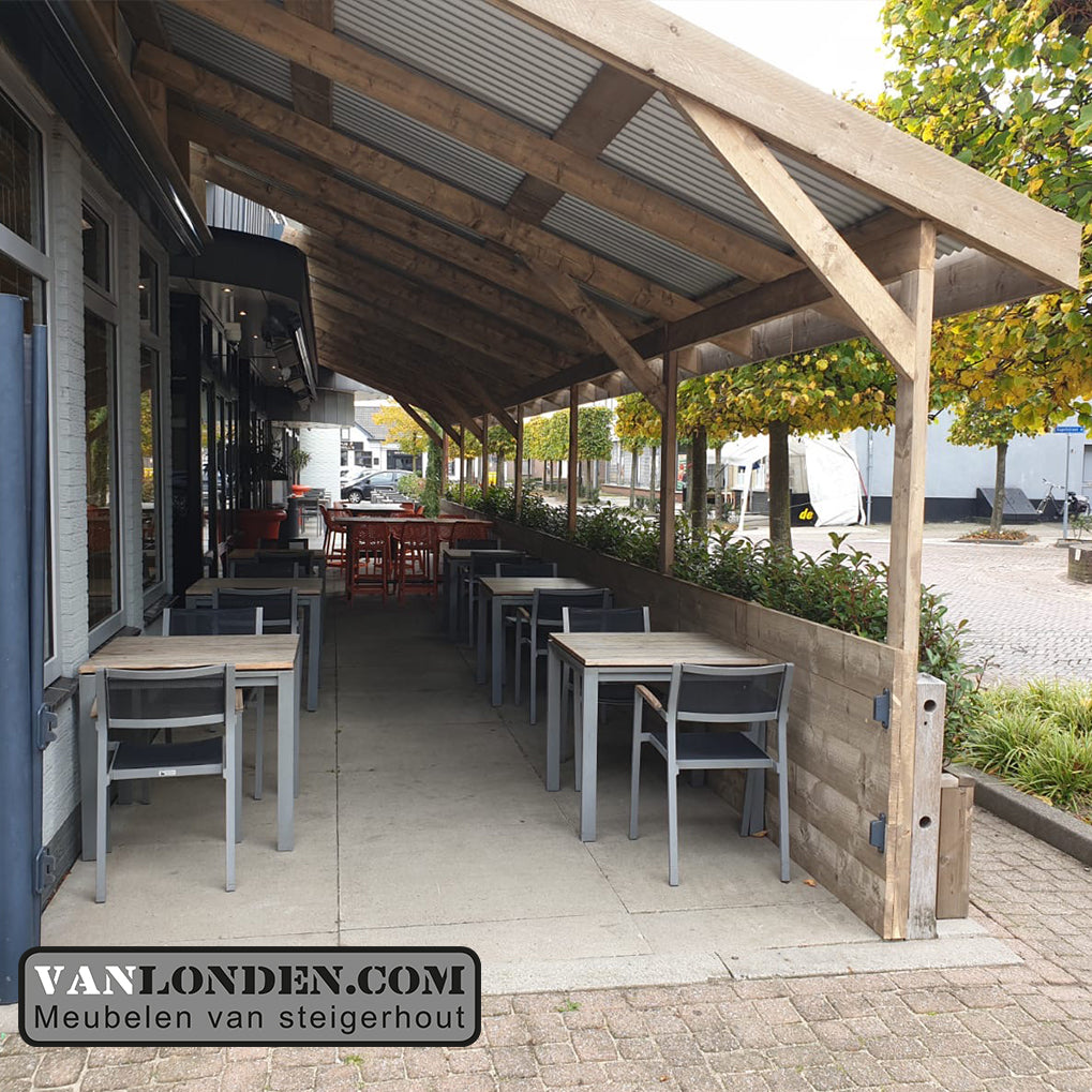 Deze overkapping is voor thuis goed toe te passen, maar ook als (tijdelijke) overkapping bij je bedrijf/ horeca. Het voorbeeld op de foto is 16 meter lang. De overkapping wordt op maat gemaakt en is eenvoudig te monteren en demonteren. Ideaal om buiten meer ruimte voor zitplaatsen te creëren voor bijv. café en restaurant in deze coronatijd, maar ook thuis om langer buiten te kunnen genieten van je tuin.