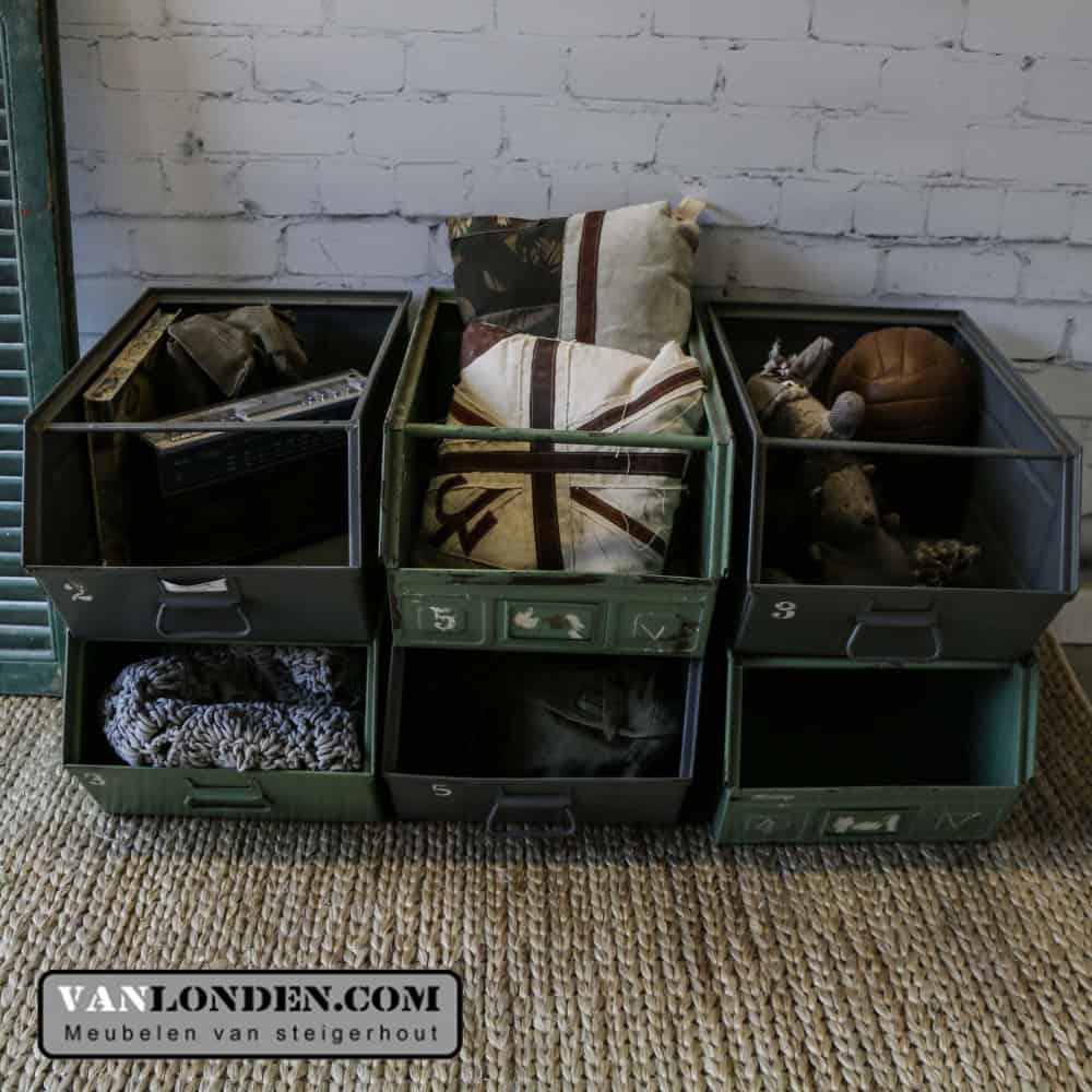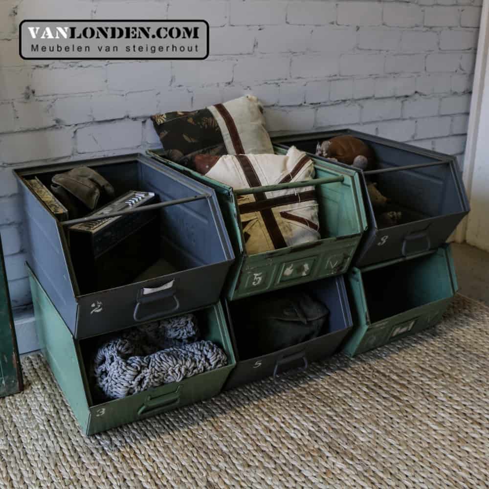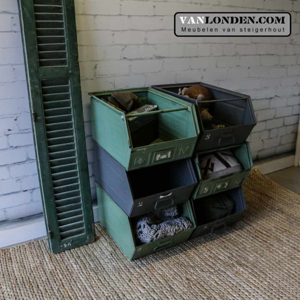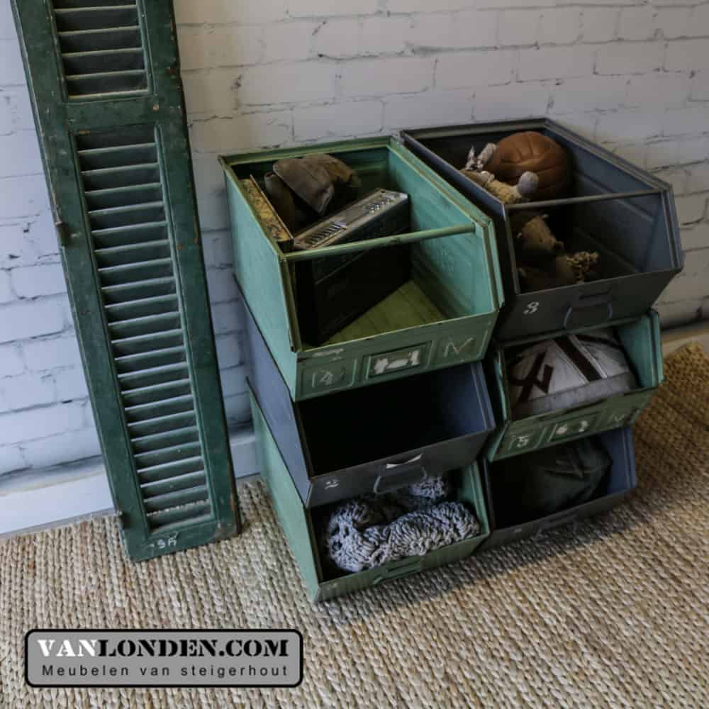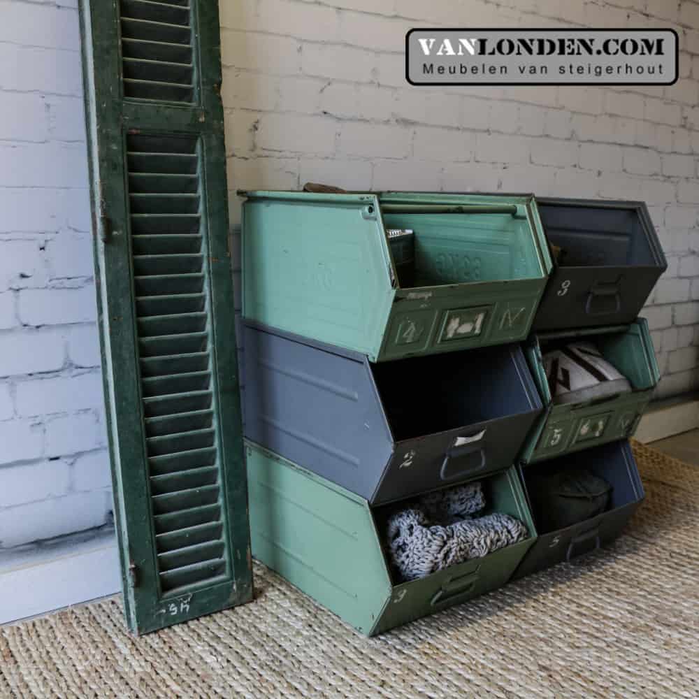 Vintage (oude) stalen stapelbakken in de kleur groen. Niet alleen handig als opbergruimte, maar gecombineerd ook als set te gebruiken.