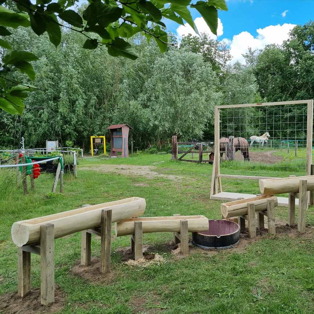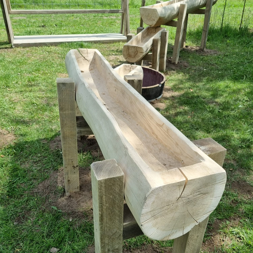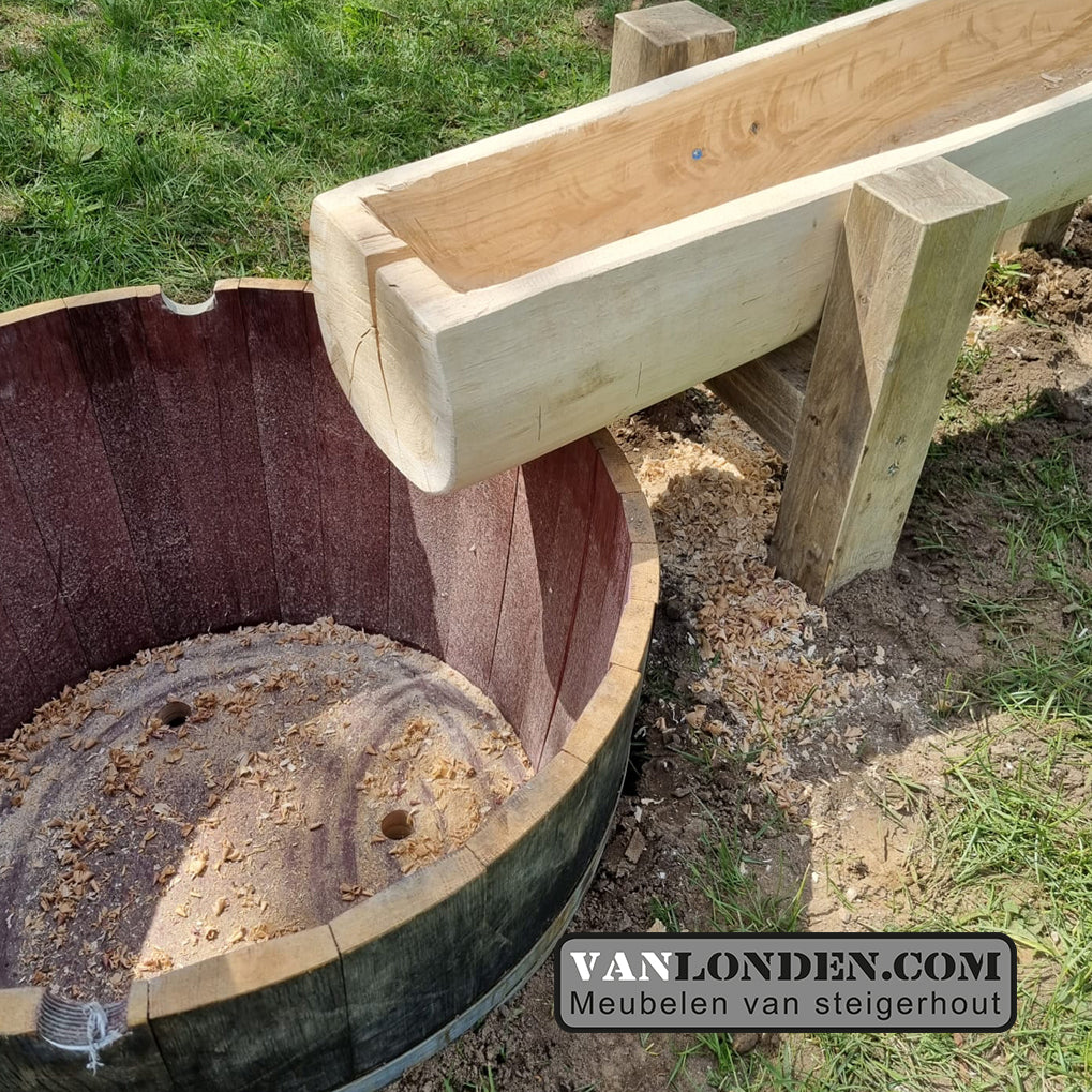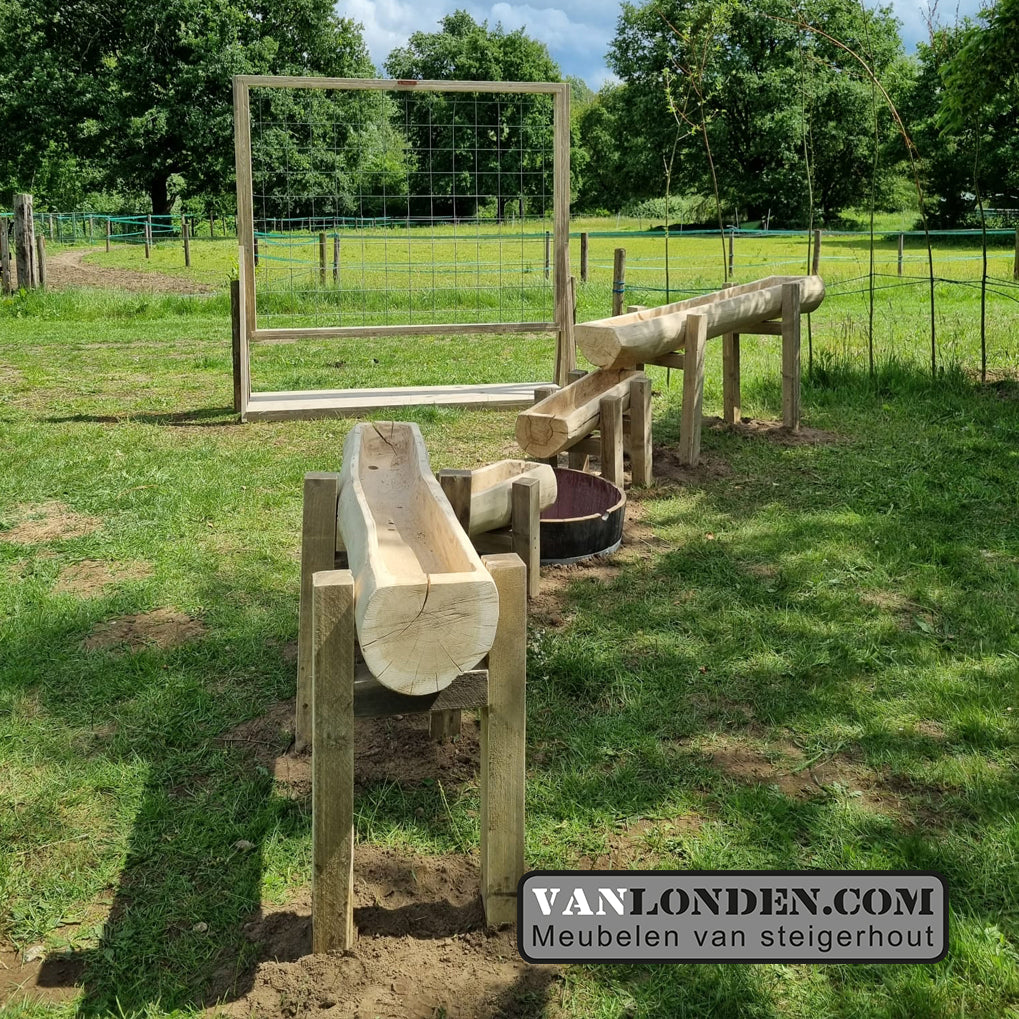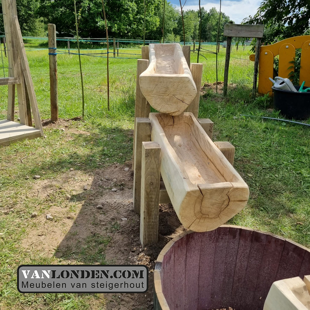 Lekker spelen met water en modder, waterpret voor de warme dagen. Deze waterbaan is gemaakt van uitgeholde boomstammen en is leuk voor thuis maar ook voor kinderdagverblijven.
