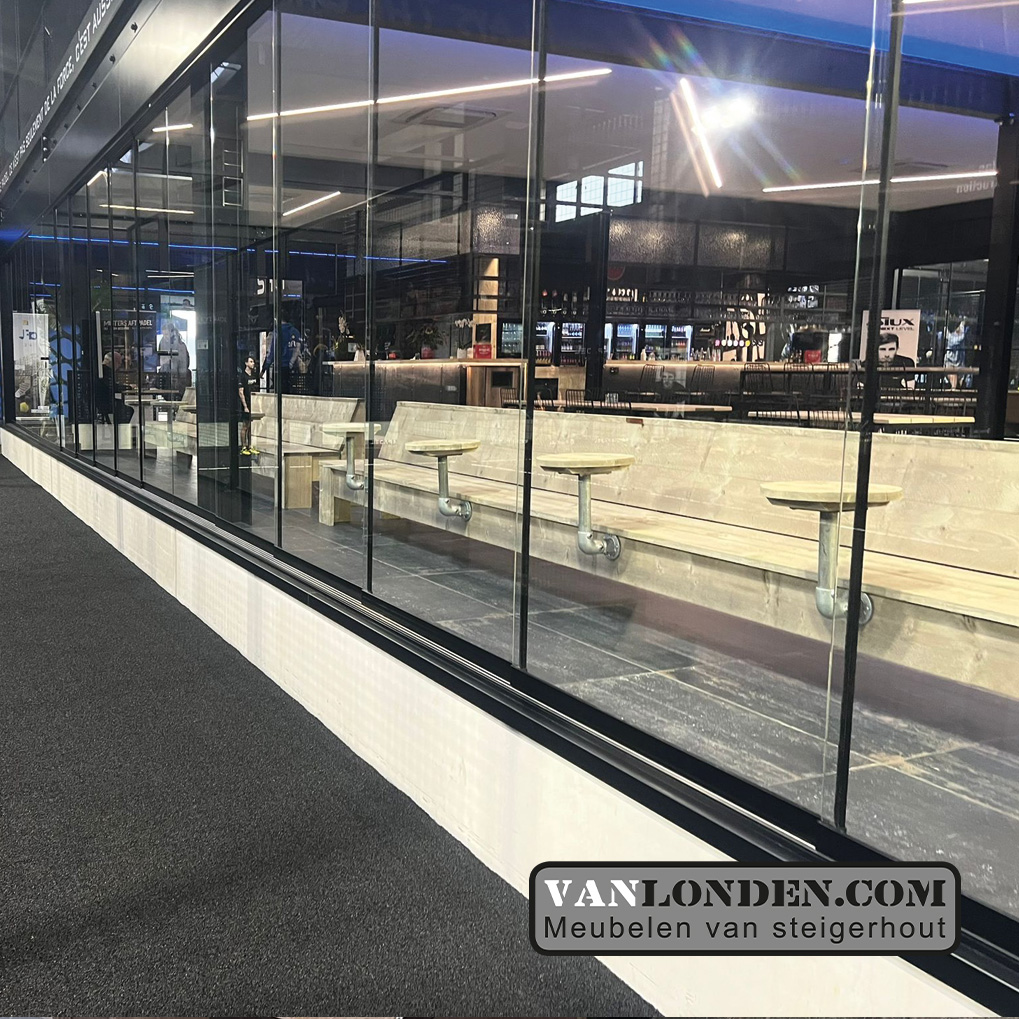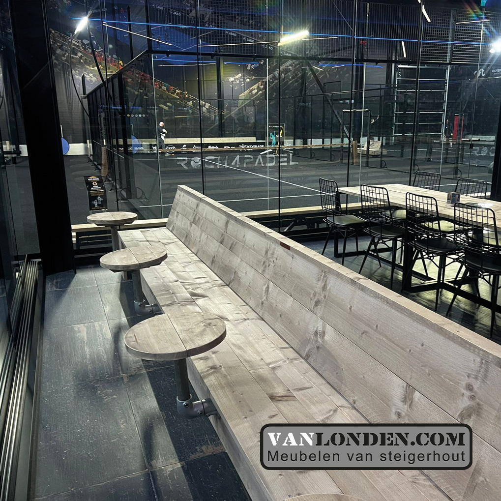Supermooie inrichting mogen maken voor een Padelbaan in de Ardennen. Sportief en stoere steigerhouten meubelen. Tribunes, tafels en banken met praktische tafeltjes die aan de bank vast zitten, allemaal van steigerhout en vormen zo een mooi geheel in de inrichting.