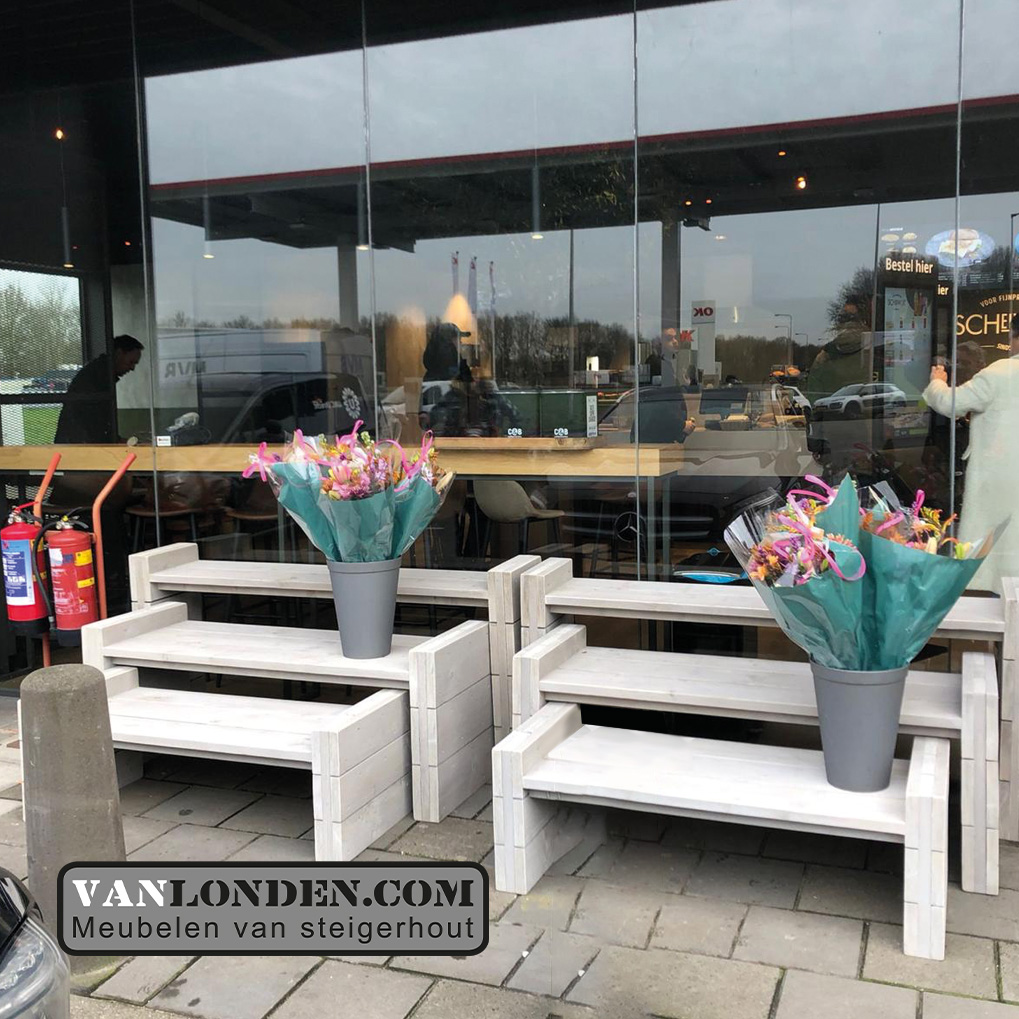 Ook een tankstation kan mooi gemaakt worden. Bijvoorbeeld met deze veelzijdige steigerhouten plantenbak, praktisch en decoratief. Trapsgewijs in 3 formaten te bestellen. Ook een idee voor je winkel of kantoorpand?