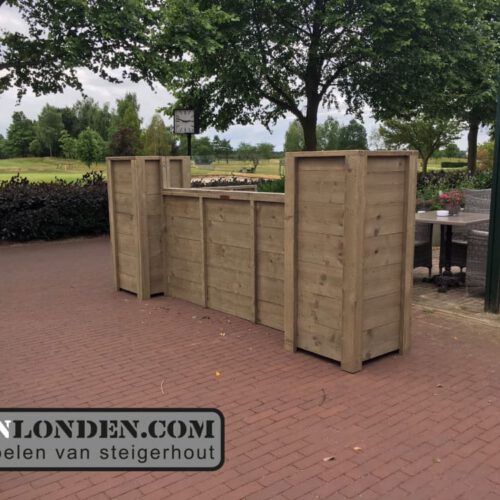Het terras van Golfbaan Prinsenbosch ziet er weer top uit met de mooie steigerhouten terraswanden.
