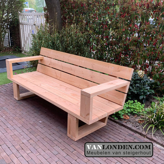 - Na behandeling met een nanocoating is een steigerhouten tuinbank ijzersterk.